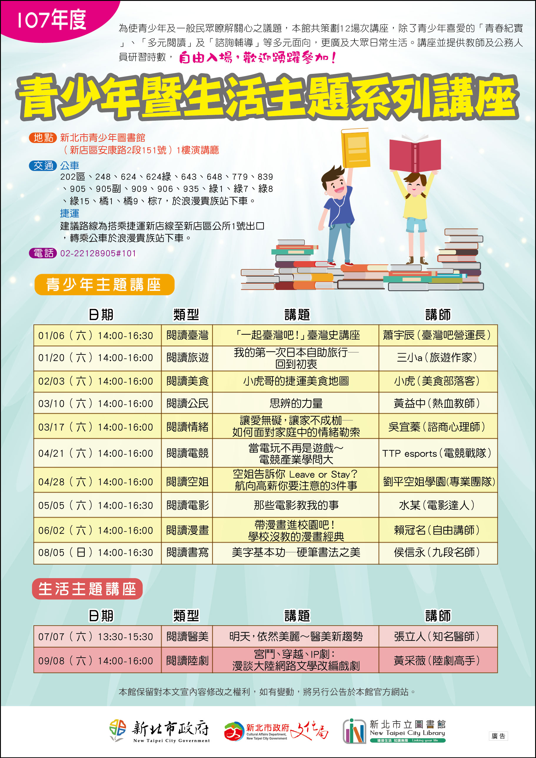 新北市立圖書館「107年度青少年暨生活主題系列講座」文宣