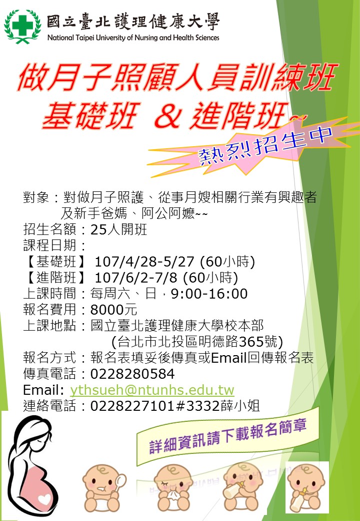 107年推廣教育中心做月子人員訓練班基礎班和進階班課程招生簡章