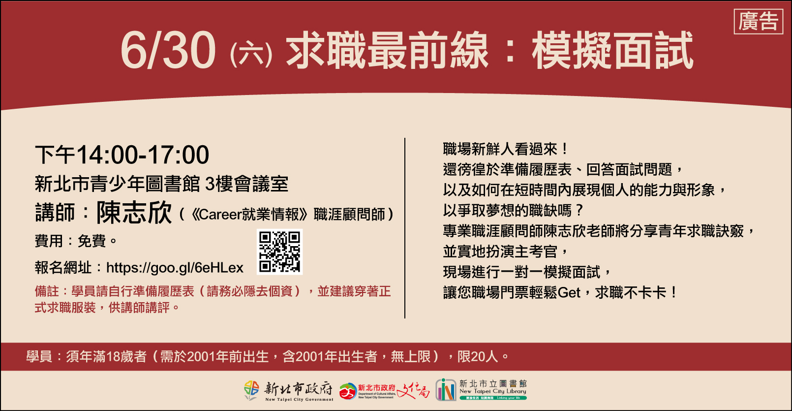 轉知:新北市青少年圖書館「求職最前線:模擬面試」文宣1份