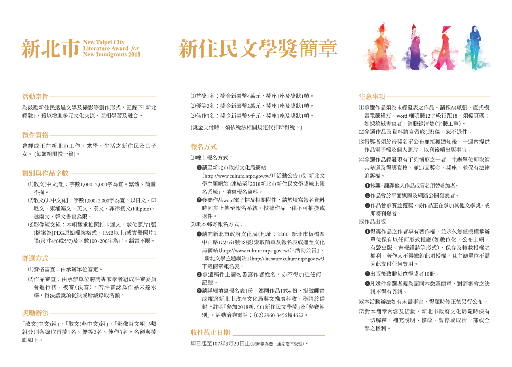 「新北市新住民文學獎」徵文活動,收件日期延長至本(107)年9月20日
