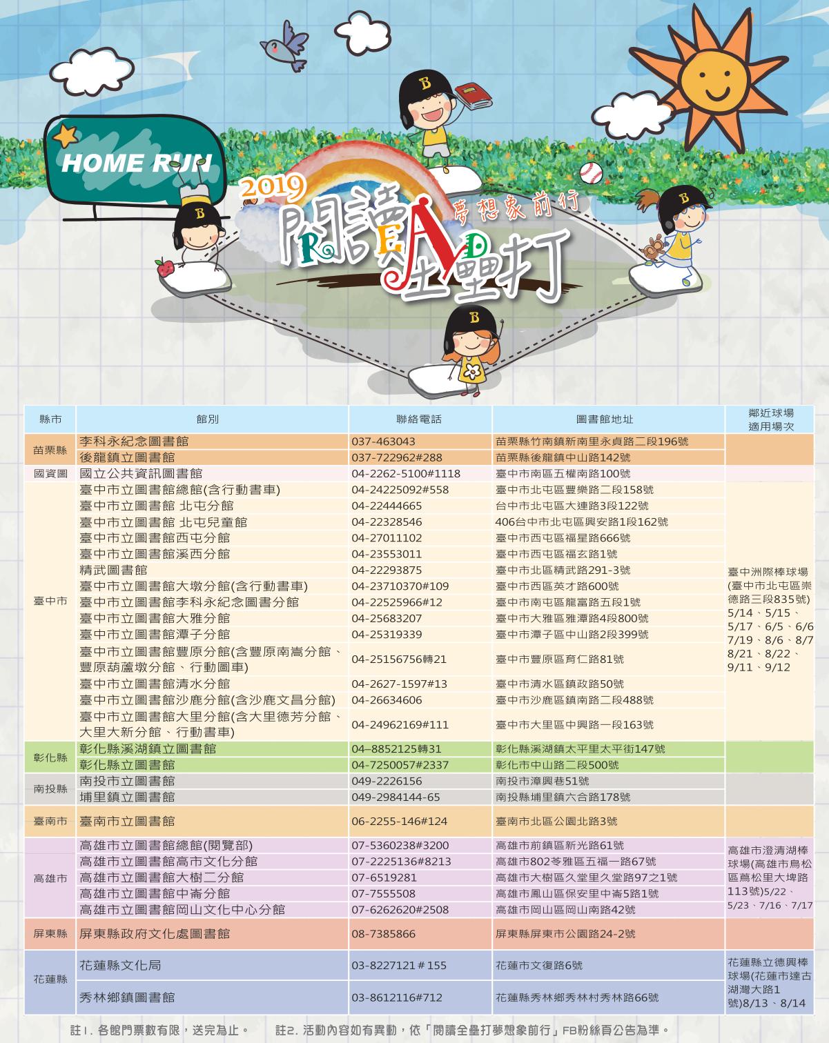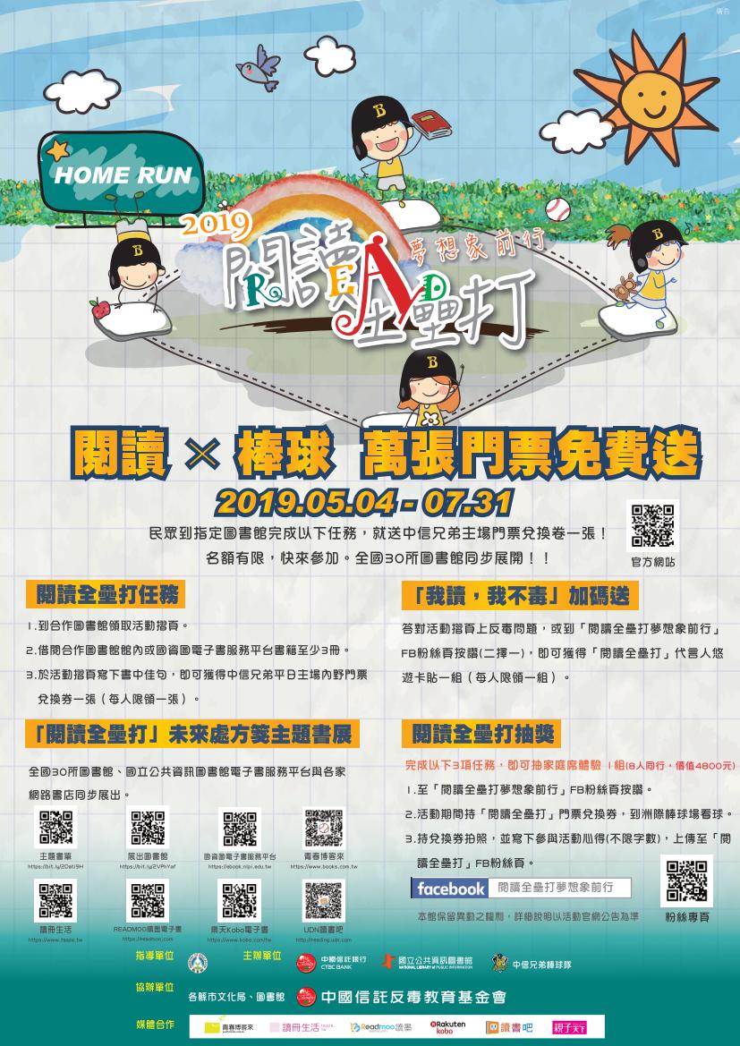 旨揭活動為推廣親子共讀,本館與中國信託銀行共同主辦「2018閱讀全壘打夢想象前行」活動,鼓勵學生及家長走進全國30所圖書館閱讀好書,就有機會兌換中信兄弟主場球票與活動代言球星卡貼等獎項。