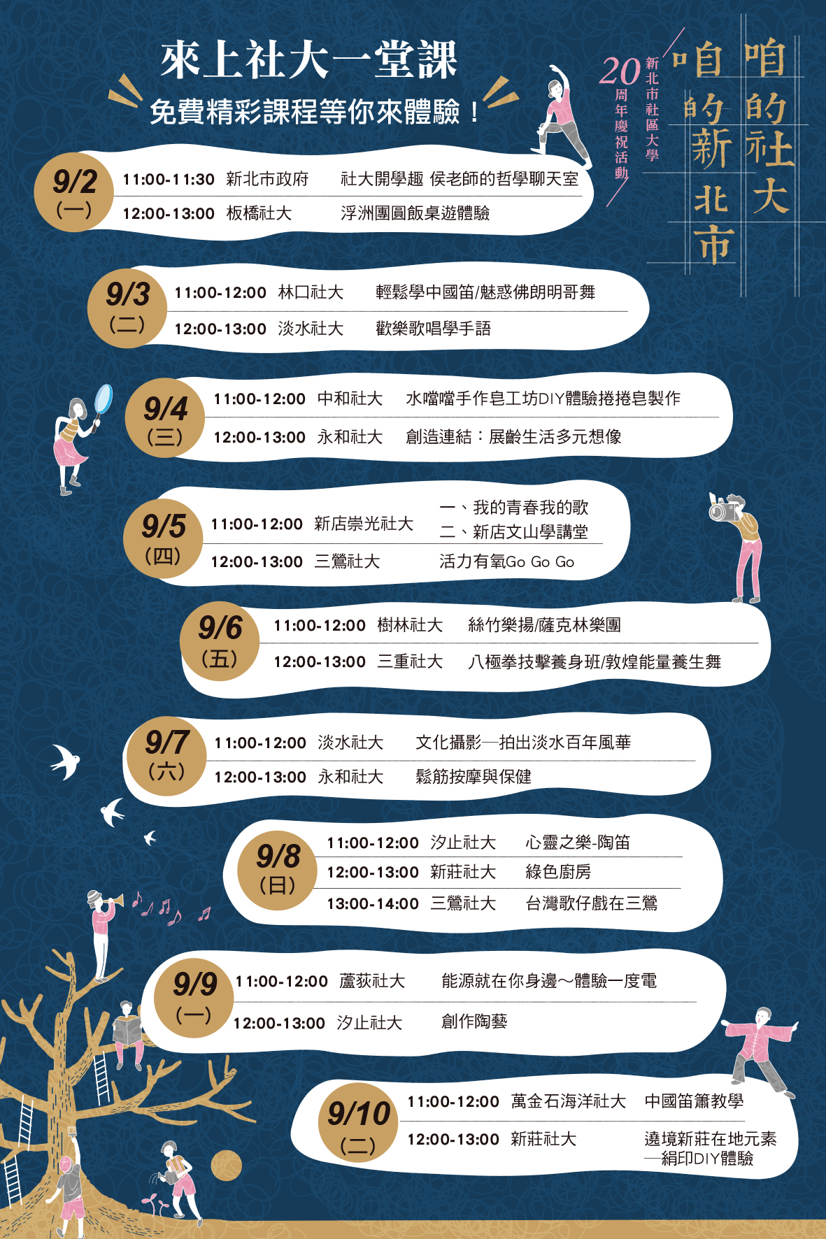 一、為慶祝本市社區大學20周年,本局訂於108年9月2日至9月10日假本府一樓大廳辦理「咱的社大 咱的新北市」新北市社區大學20周年慶祝活動。