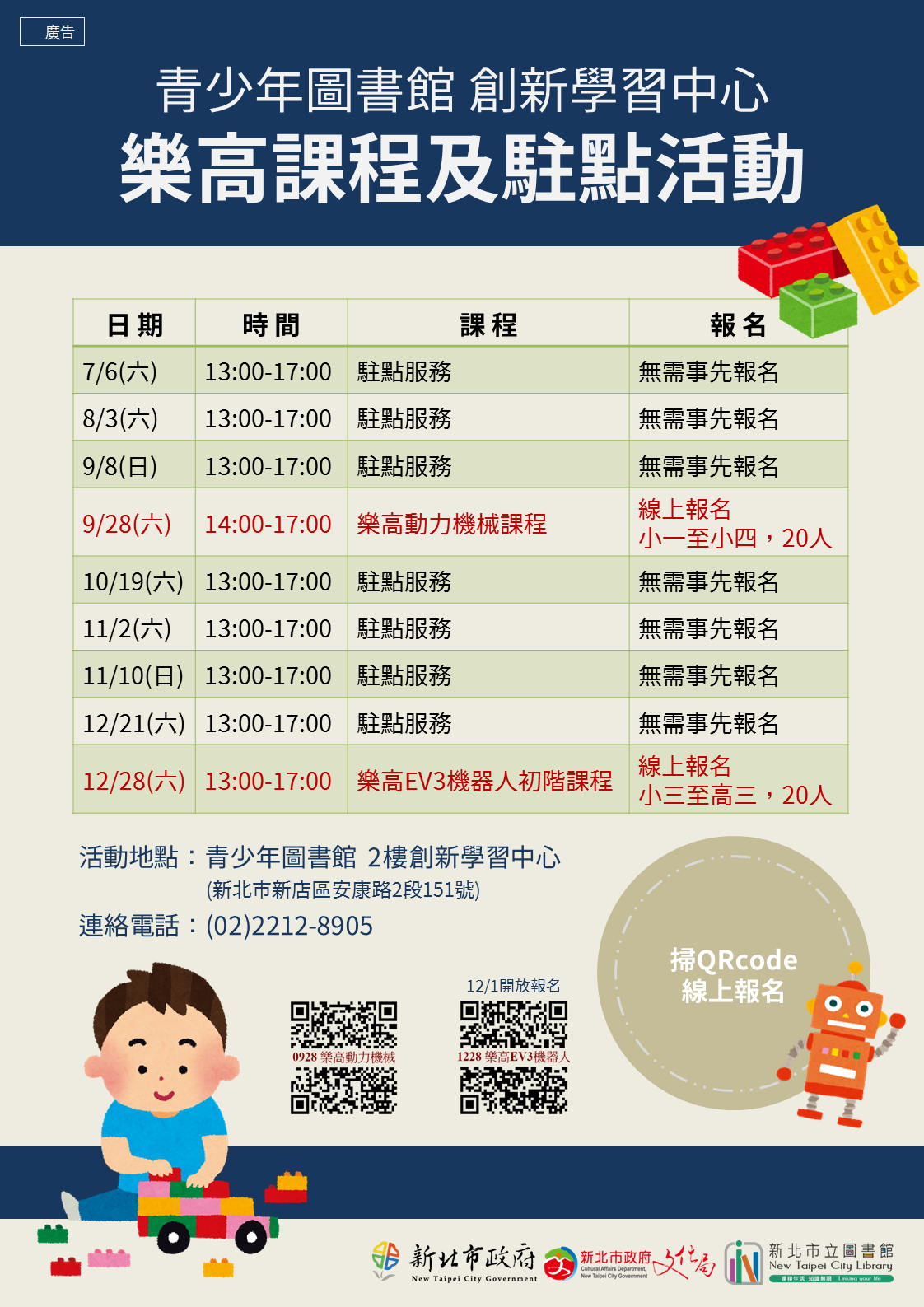 轉知:新北市青少年圖書館「108年下半年度樂高課程及駐點服務」活動資訊