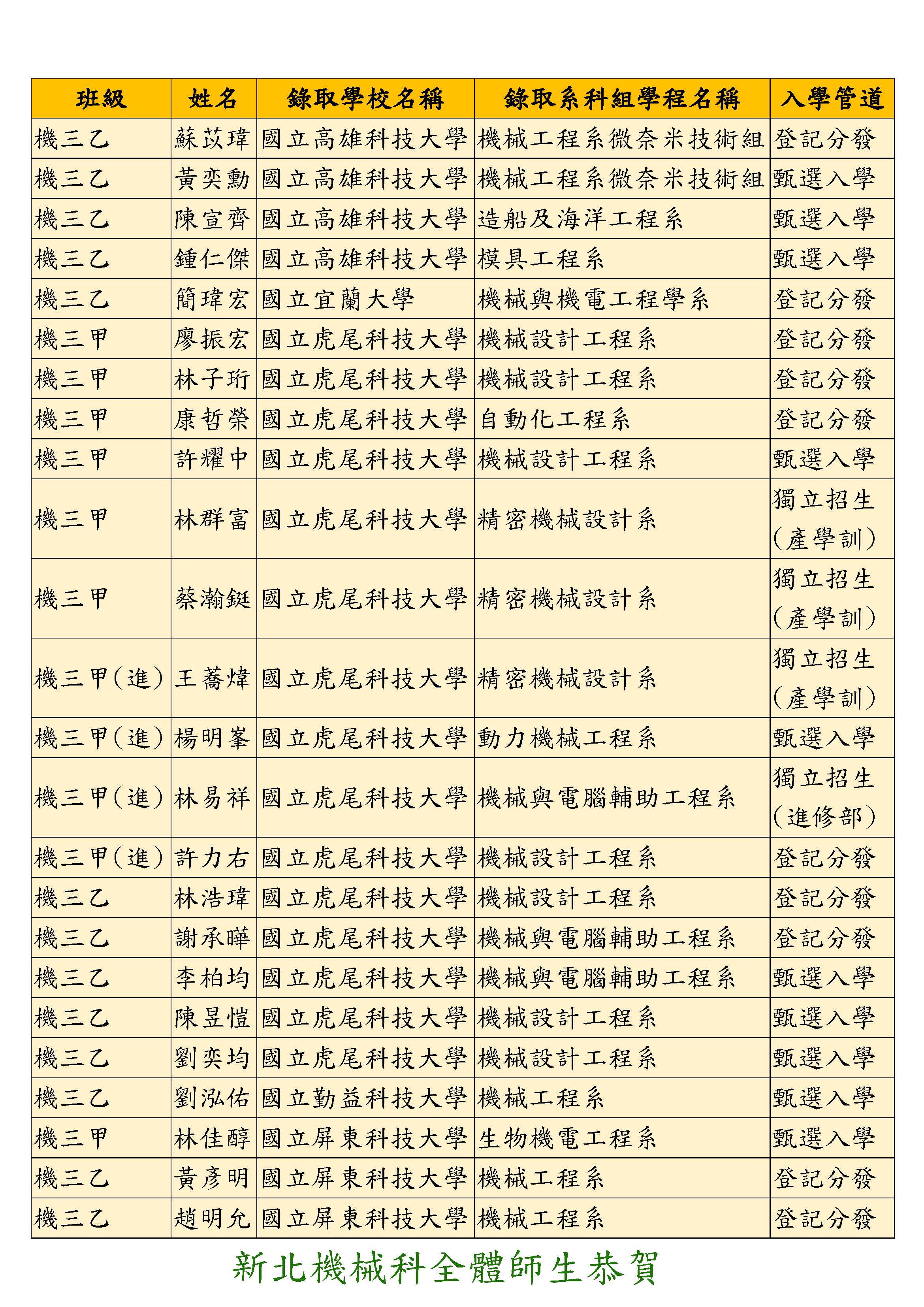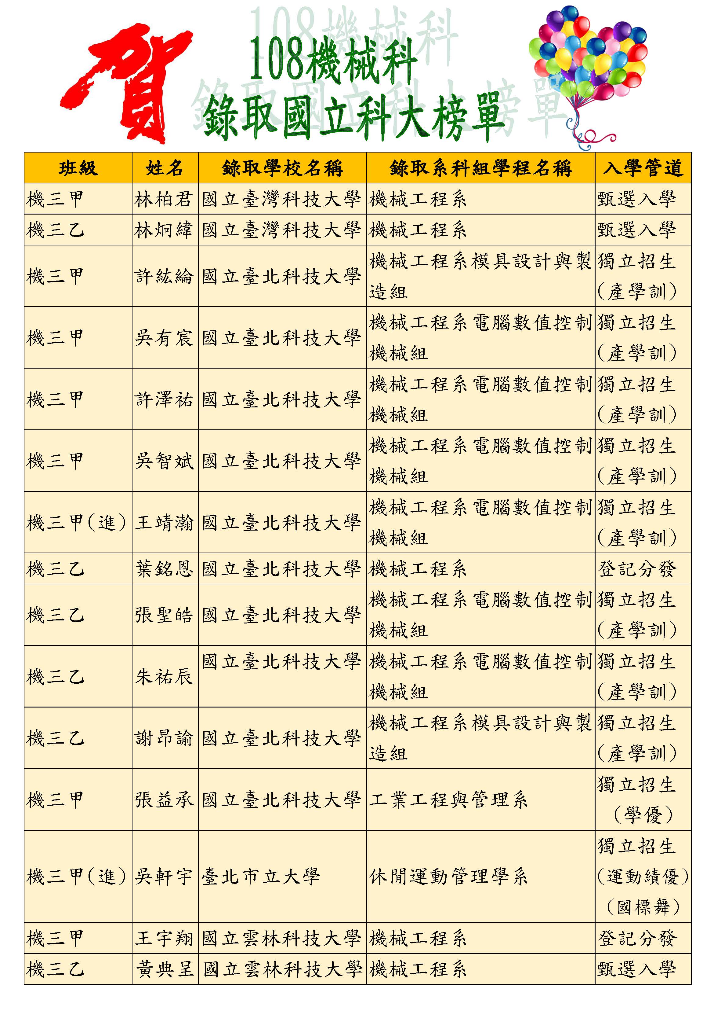 108年錄取臺科2位、北科10位、 臺北市立大學1位,