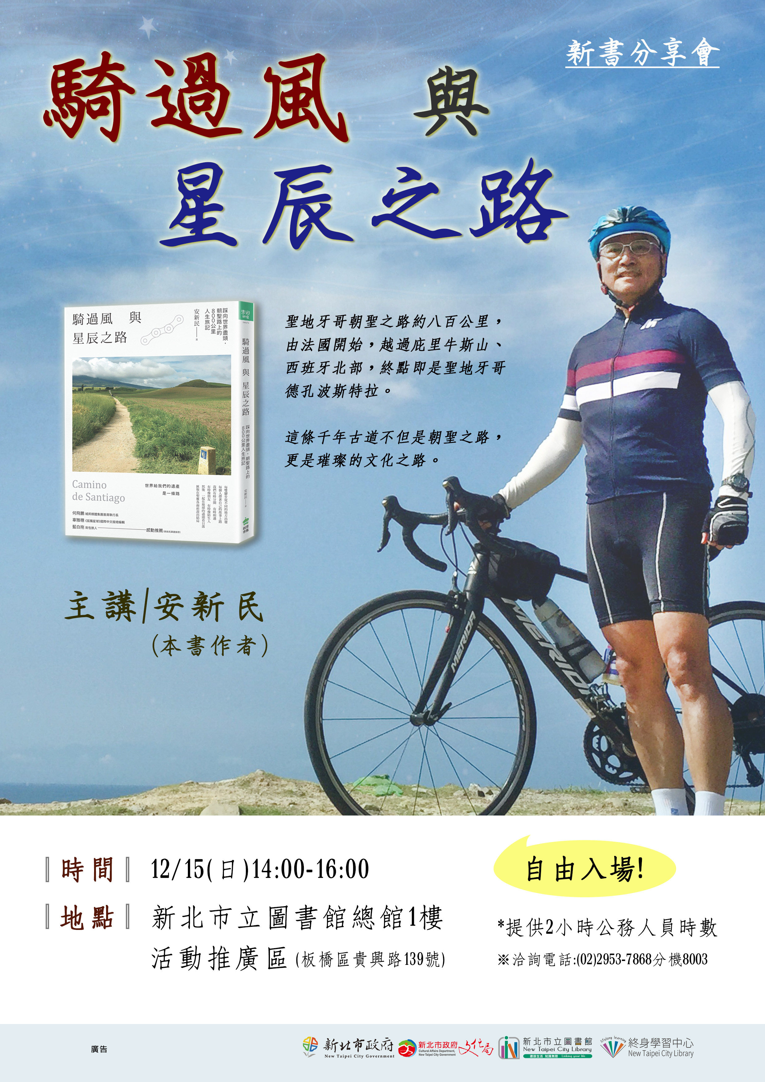 二、12月15日(日)與新店崇光社區大學合作辦理「騎過風與星辰之路」,邀請作者安新民老師分享他的西班牙朝聖之路,不容錯過。