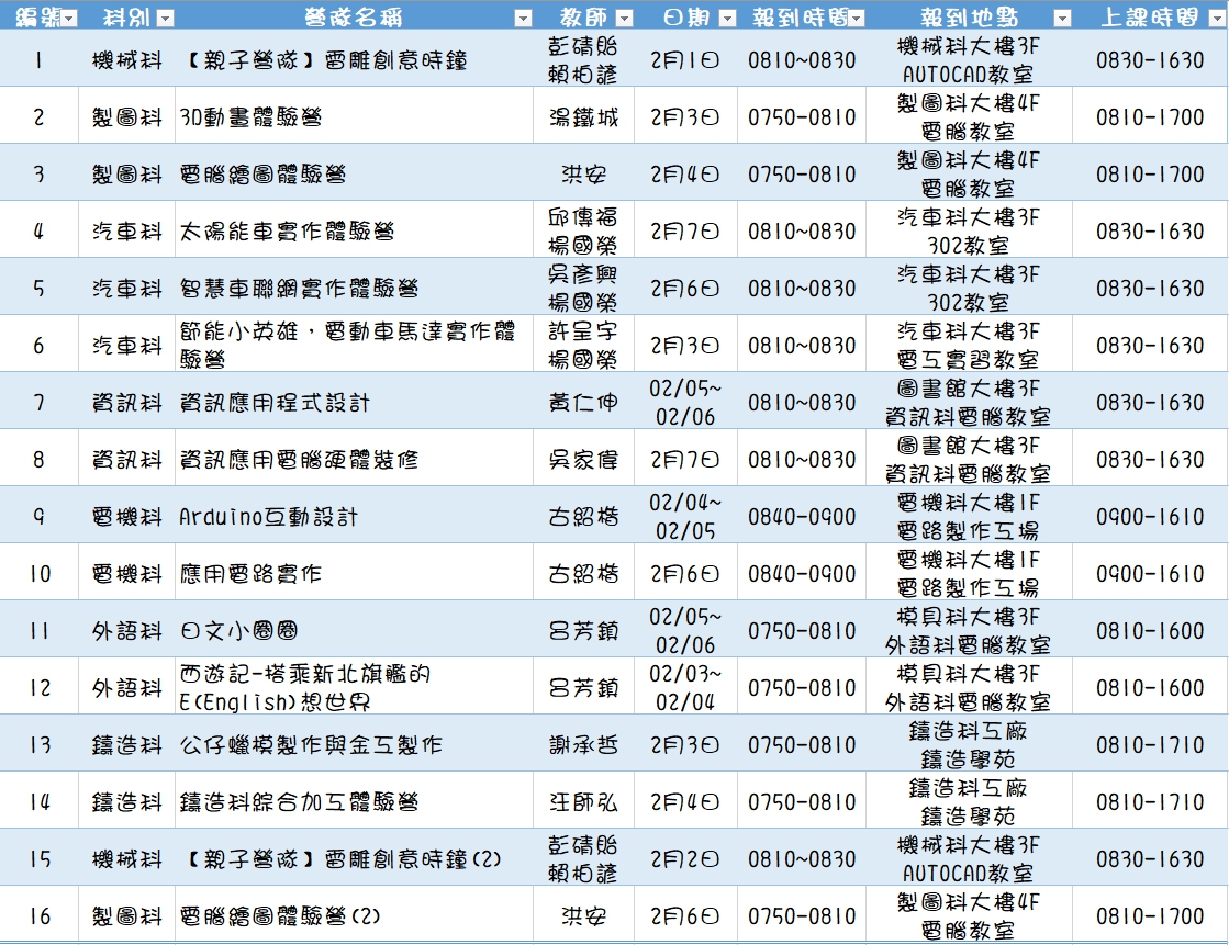 一、 本年度辦理暑假育樂營共計16場,各營隊資訊如下圖,錄取名單詳附件。