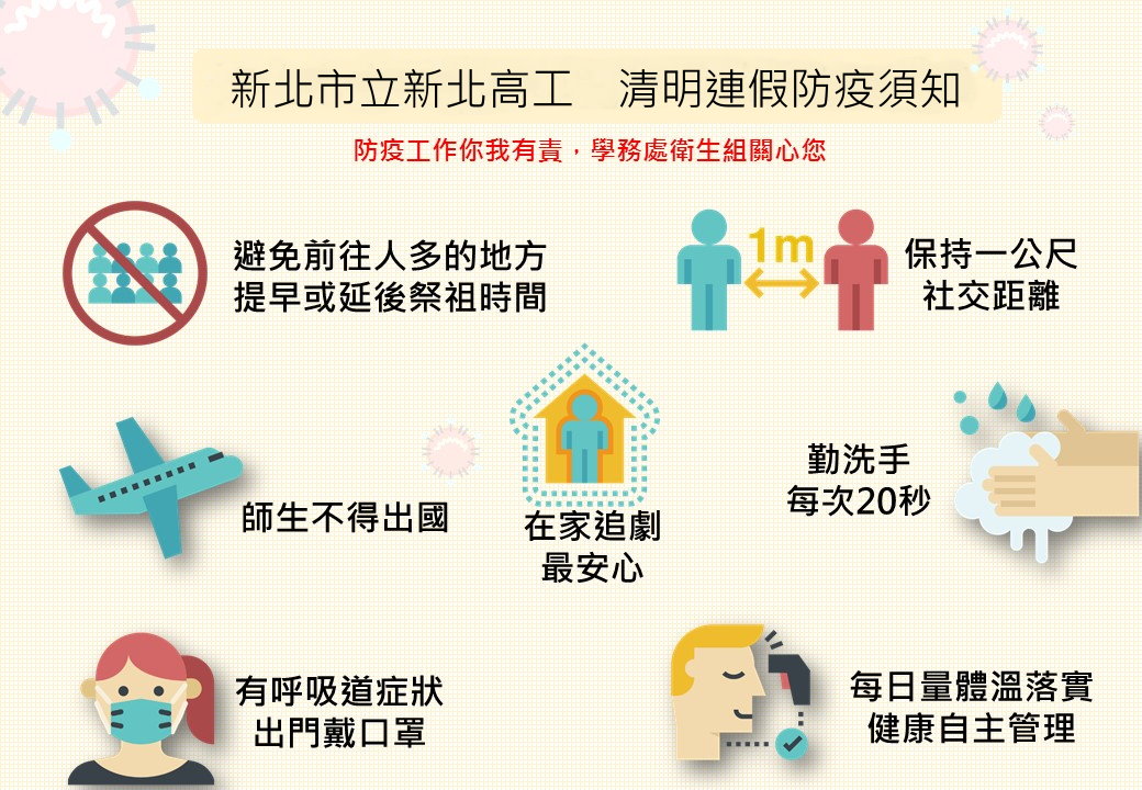 三、預期清明掃墓假期將有大量國人返臺,請貴校提醒所屬人員於假期期間減少出入公共場所及避免參加非必要性的聚會。