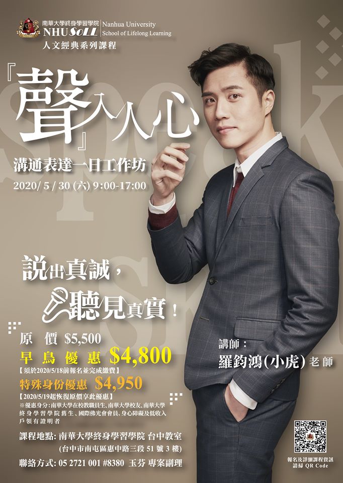 轉知:南華大學終身學習學院2020「 聲入人心-溝通表達一日工作坊」,報名資訊詳如說明。