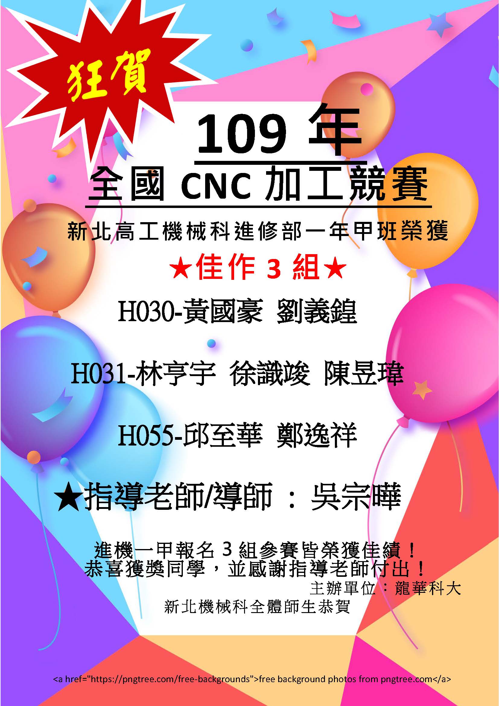 <狂賀>109年全國CNC加工競賽進修部機一甲榮獲佳作3組