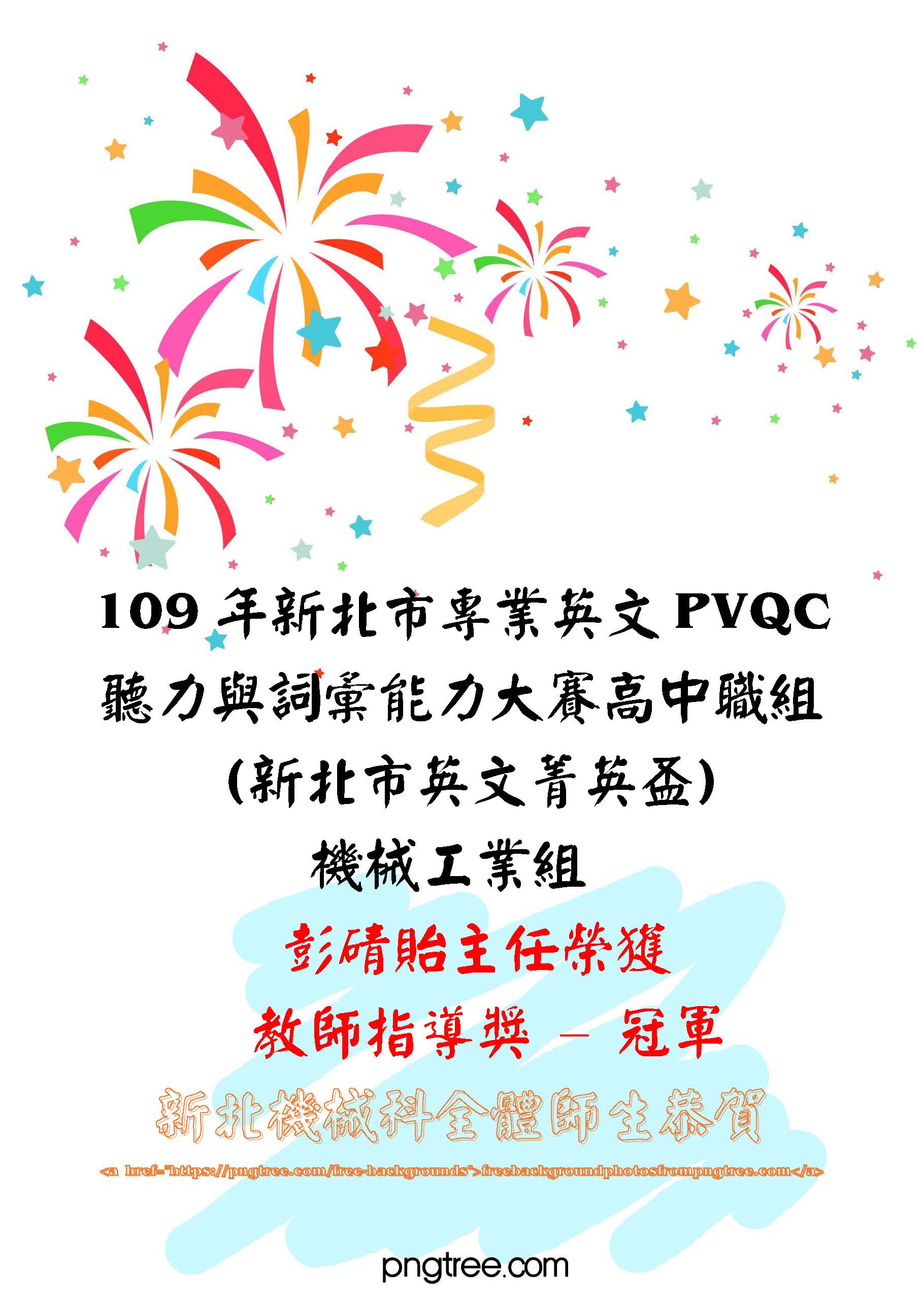 <狂賀> 109年新北市英文菁英盃 彭碃貽主任榮獲機械工業組 教師指導獎 冠軍