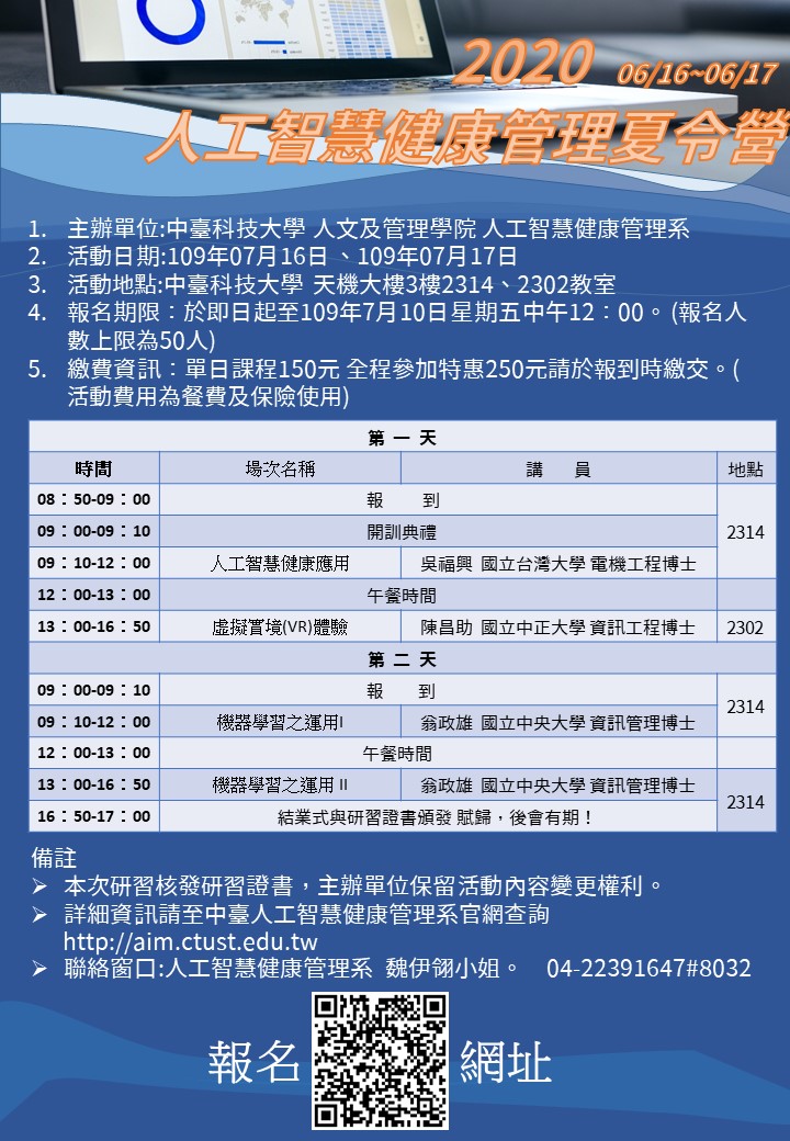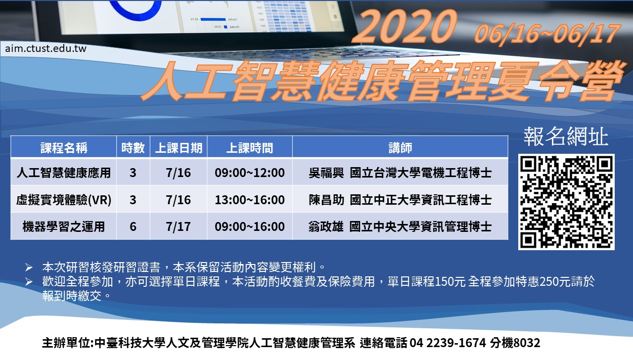 轉知:中臺科技大學人工智慧健康管理系為辦理「2020人工智慧健康管理夏令營」。