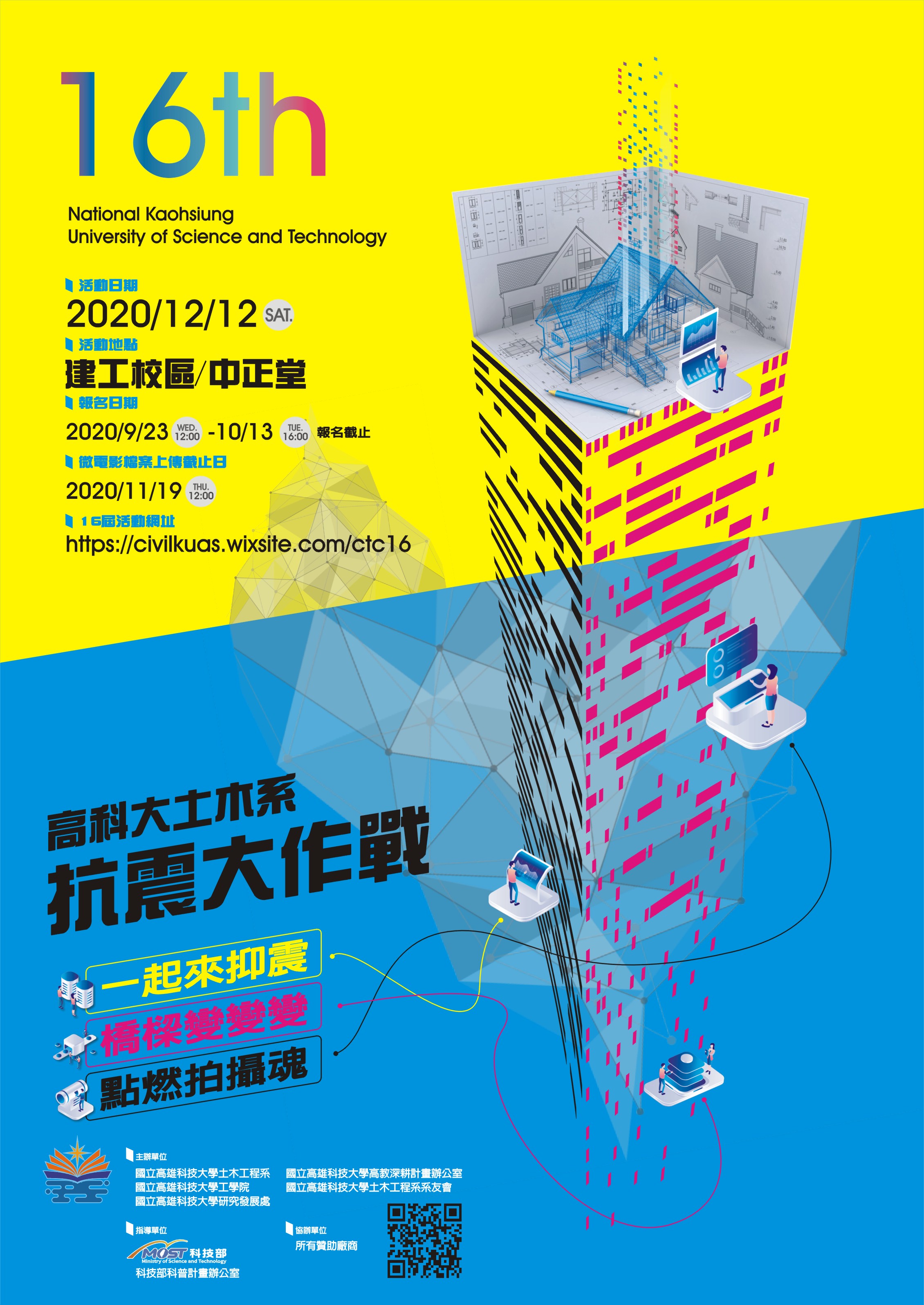 轉知:國立高雄科技大學土木系舉辦「第16屆高科大土木系抗震大作戰:一起來抑震+橋梁變變變&amp;amp;amp;amp;amp;影領創視界」活動海報。