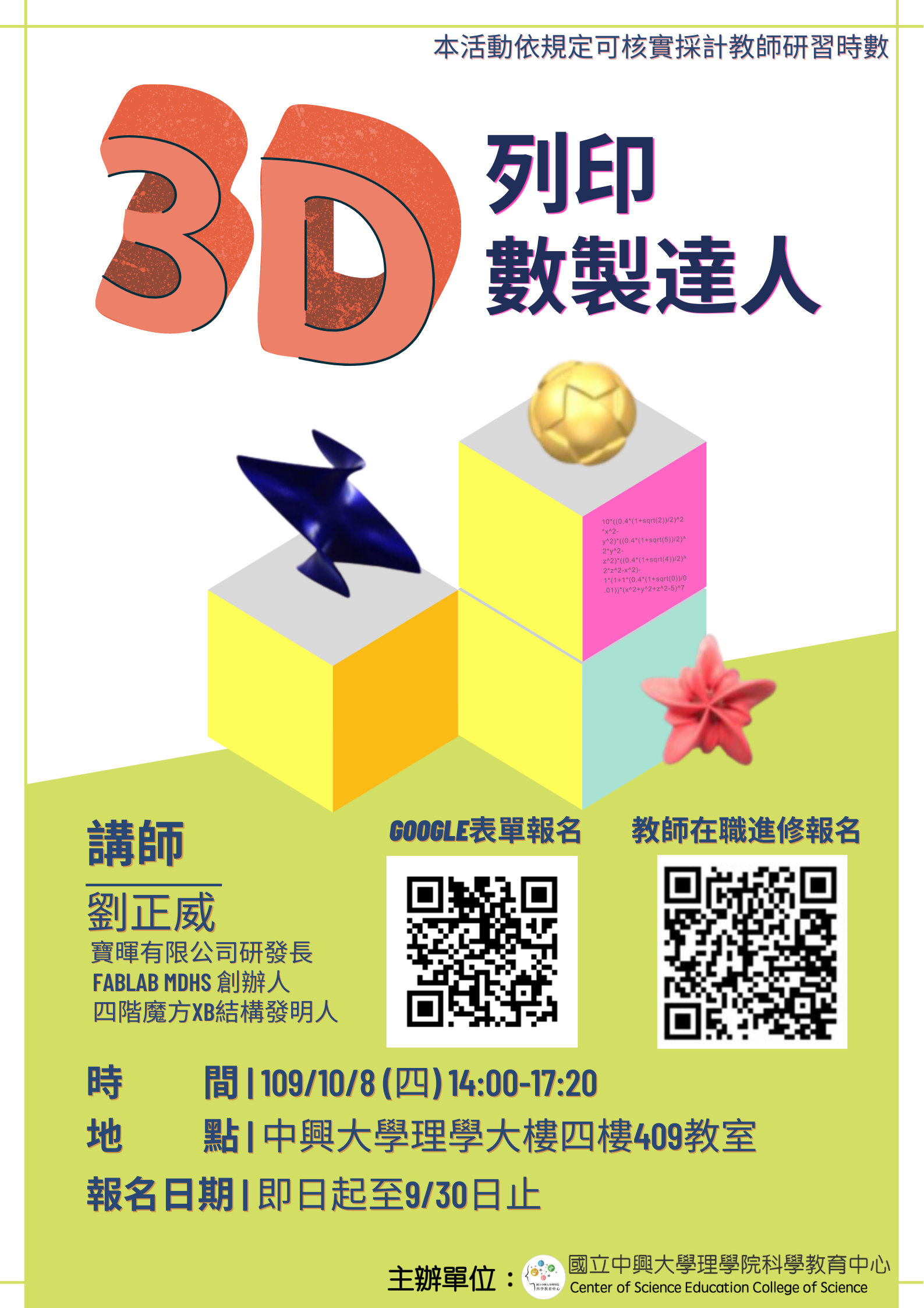 轉知:國立中興大學理學院科學教育中心於109年10月8日在國立中興大學辦理「3D列印數製達人」研習活動。