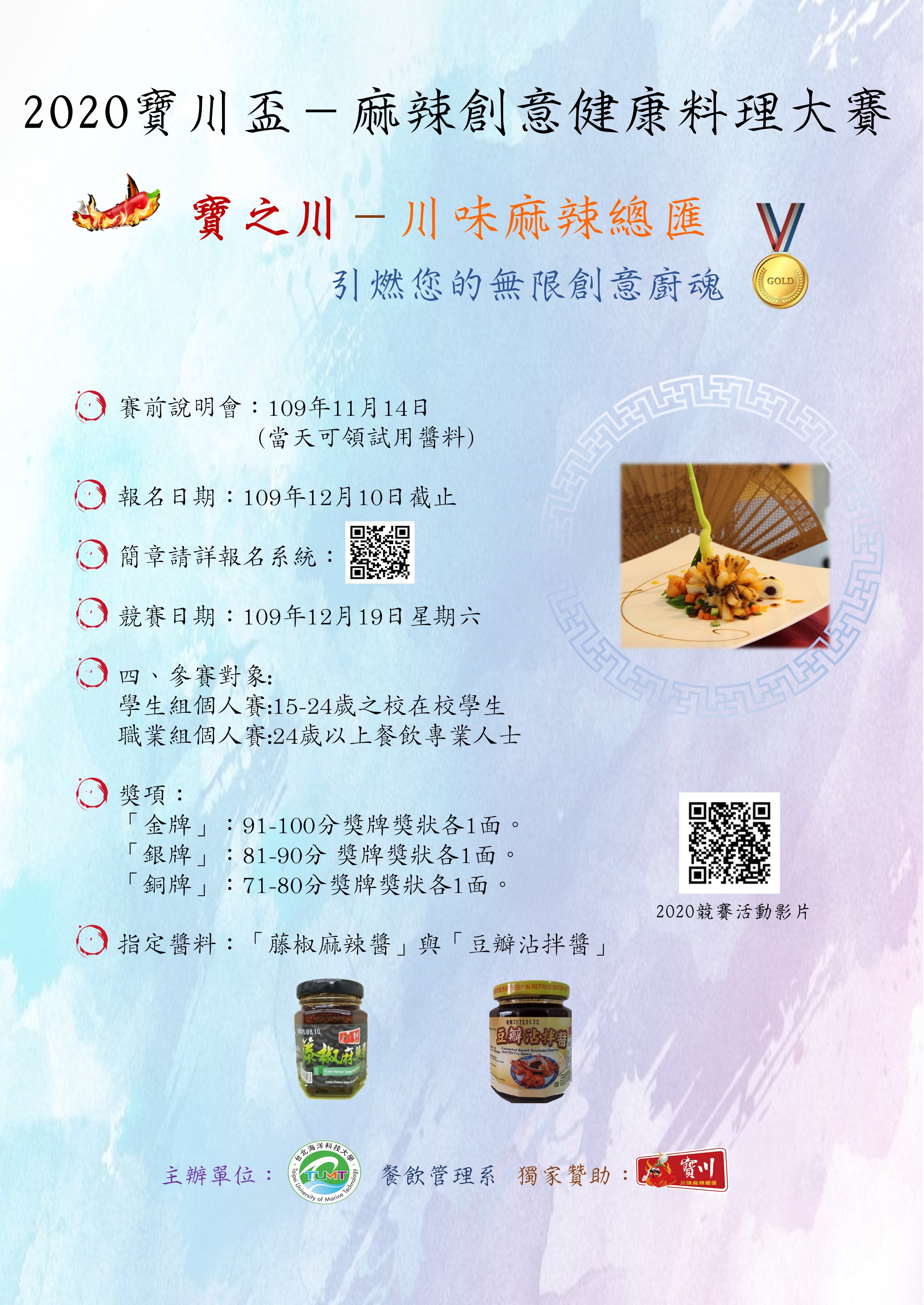 轉知:財團法人台北海洋科技大學餐飲管理系舉辦「2020寶之川-麻辣創意健康料理大賽」,報名簡章及相關資料如附件。
