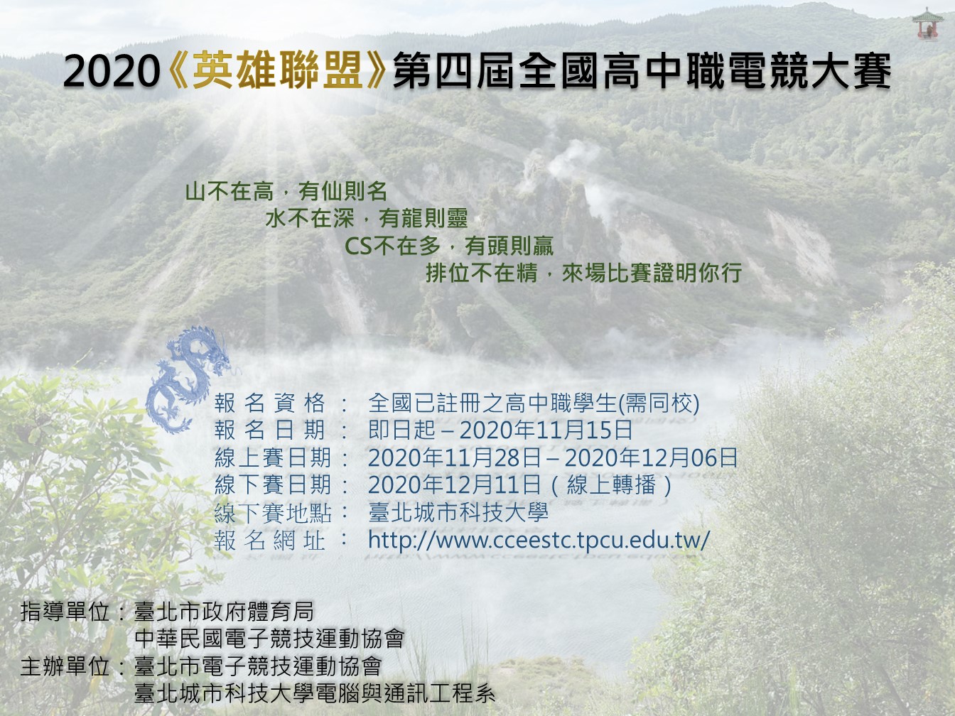 轉知:財團法人臺北城市科技大學電腦與通訊工程系主辦之『2020《英雄聯盟》第四屆全國高中職電競大賽』。