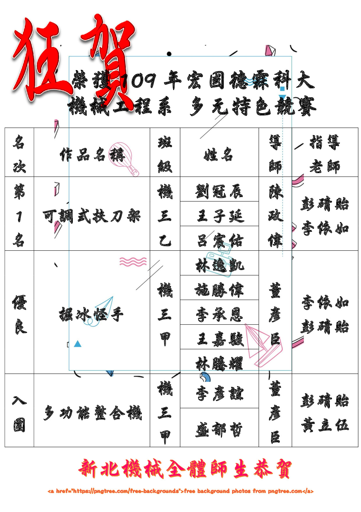 <狂賀> 高三參加多元特色競賽-機械工程系-機械類 榮獲第1名、優良、入圍