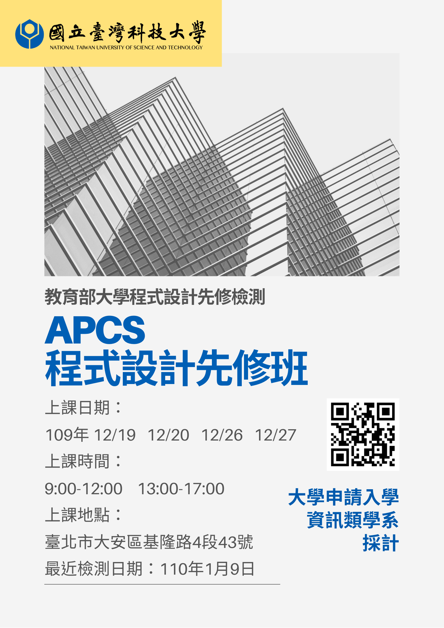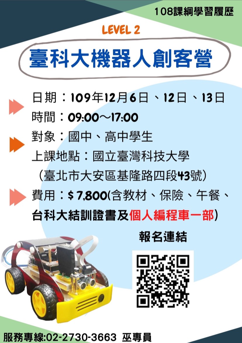 轉知:因應108課綱教育願景,國立臺灣科技大學擬辦理「APCS程式設計先修班」、「臺科大機器人創客營」,敬附活動海報。