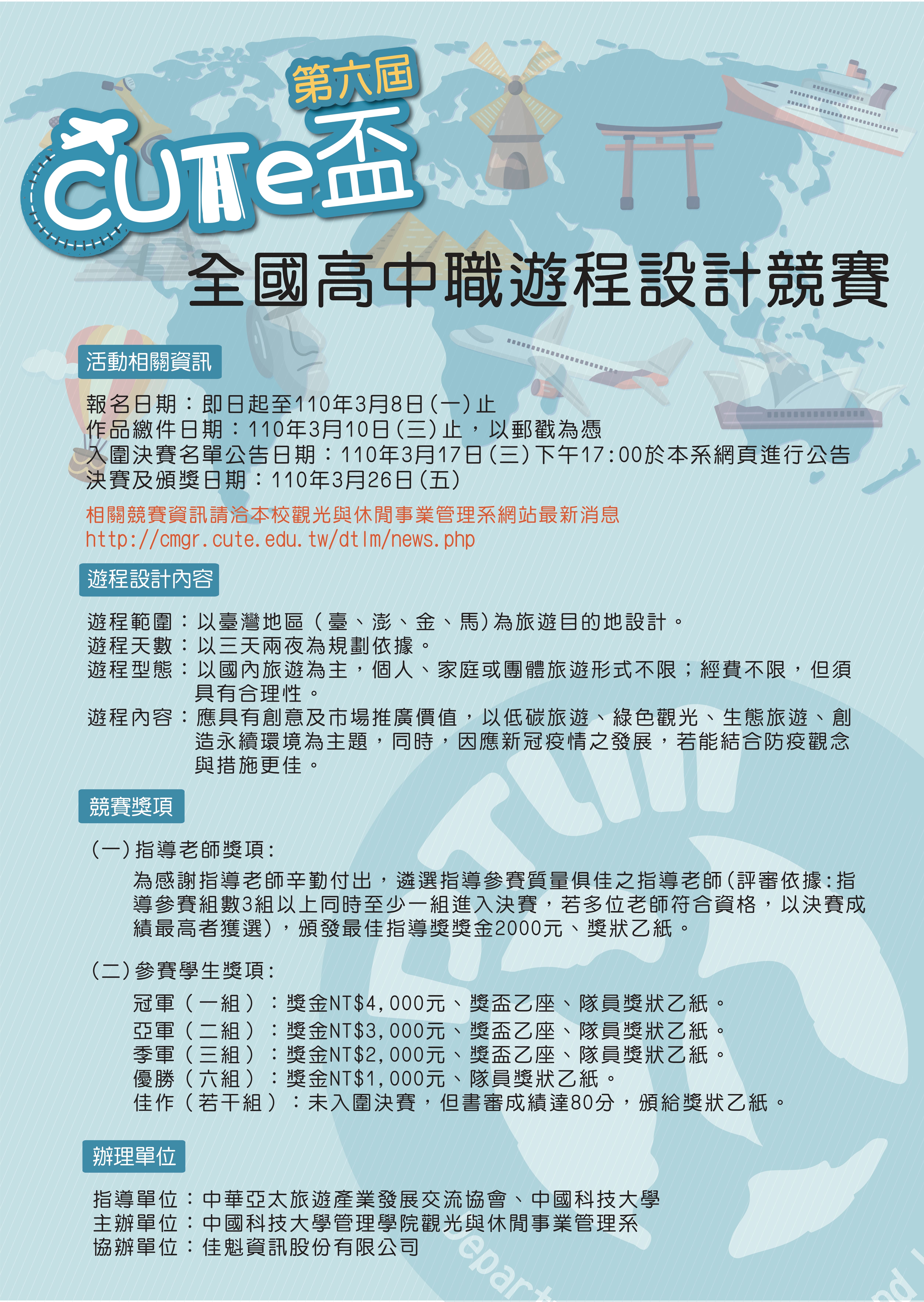 轉知:中國科技大學辦理109學年度第六屆CUTe盃全國高中職遊程設計競賽。