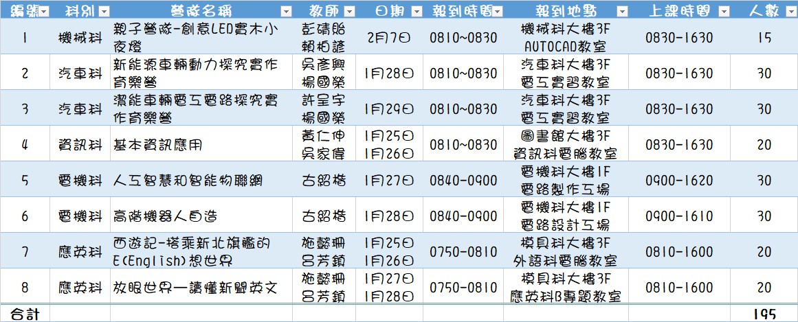 [公告]本校110年度國中生職業試探寒假育樂營開辦營隊資訊如說明,歡迎各國中生踴躍報名。