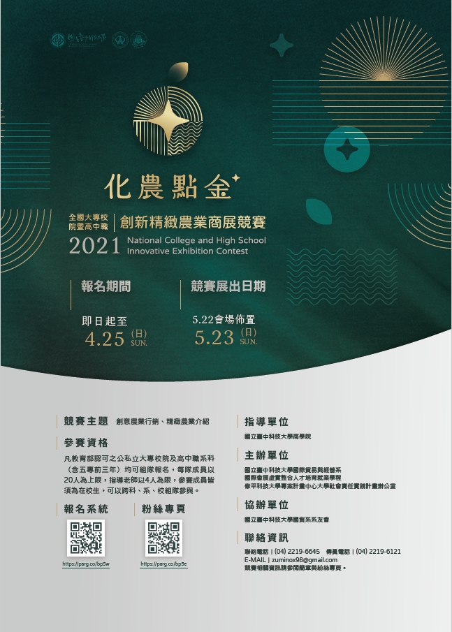 一、比賽目的:在全球經濟貿易環境下,尤其全球商務邁向跨境電商趨勢,本校特舉辦2021全國大專校院暨高中職創新精緻農業商展競賽,鼓勵國內大專校院與高中職之國貿、會展、行銷、休閒與農業等相關科系學生,以實體展覽與數位貿易為學習核心,實踐「做中學」的理念,期透過競賽平台,訓練學生線上線下的佈展、英文產品行銷能力與商務溝通能力,以達到結合校園資源為臺灣在地精緻農業發展盡一份力。