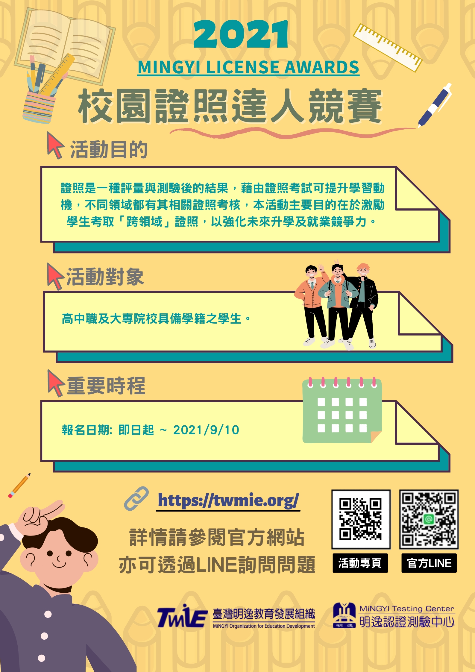 一、旨揭「2021 MiNGYI明逸校園證照達人競賽」係期勉學子藉由自身考取證照經驗,將考照學習歷程透過創意及發想轉換成「文稿」或「影音」。 二、證照係經由評量與測驗後達標準的成果,透過證照考試可提升學習動機,不同領域都有其相關認證考核,本競賽主要目在於激勵學生考取「跨領域」證照,以強化未來升學及就業競爭力。 三、活動對象:高中職及大專院校具備學籍學生。 四、報名費用:免費 五、競賽重要時程如下: (一)報名期間:即日起~2021/09/10止 (二)評核時間:2021/10/01~2021/11/19 (三)成績公告:2021/12/19以前 六、本文附件海報電子檔(如附件)。 ![]() 瀏覽數