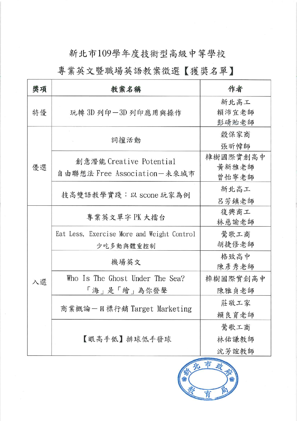 <狂賀>科主任榮獲新北市專業英文暨職場英語教案比賽 特優