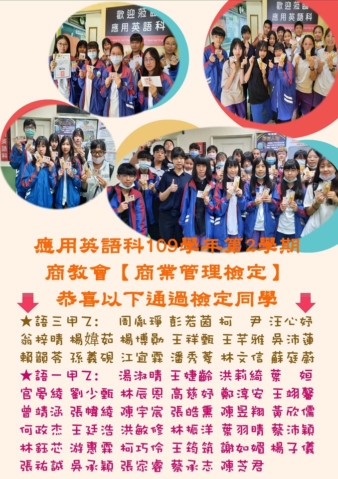 【專業檢定】恭喜應用英語科109學年第2學期 商教會【商業管理檢定】通過檢定同學