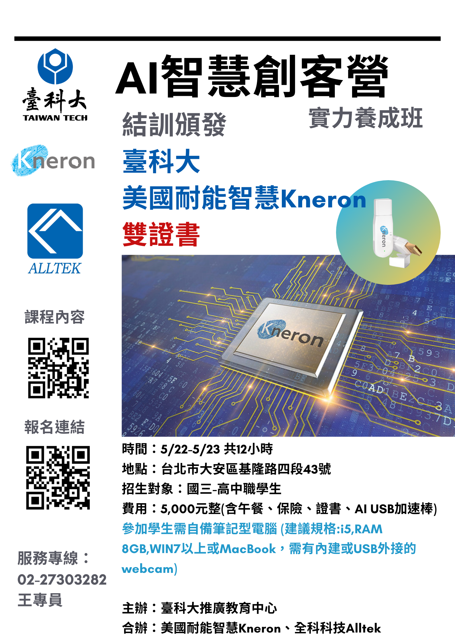 轉知:國立臺灣科技大學辦理「AI智慧創客營(實力養成班)」活動海報。