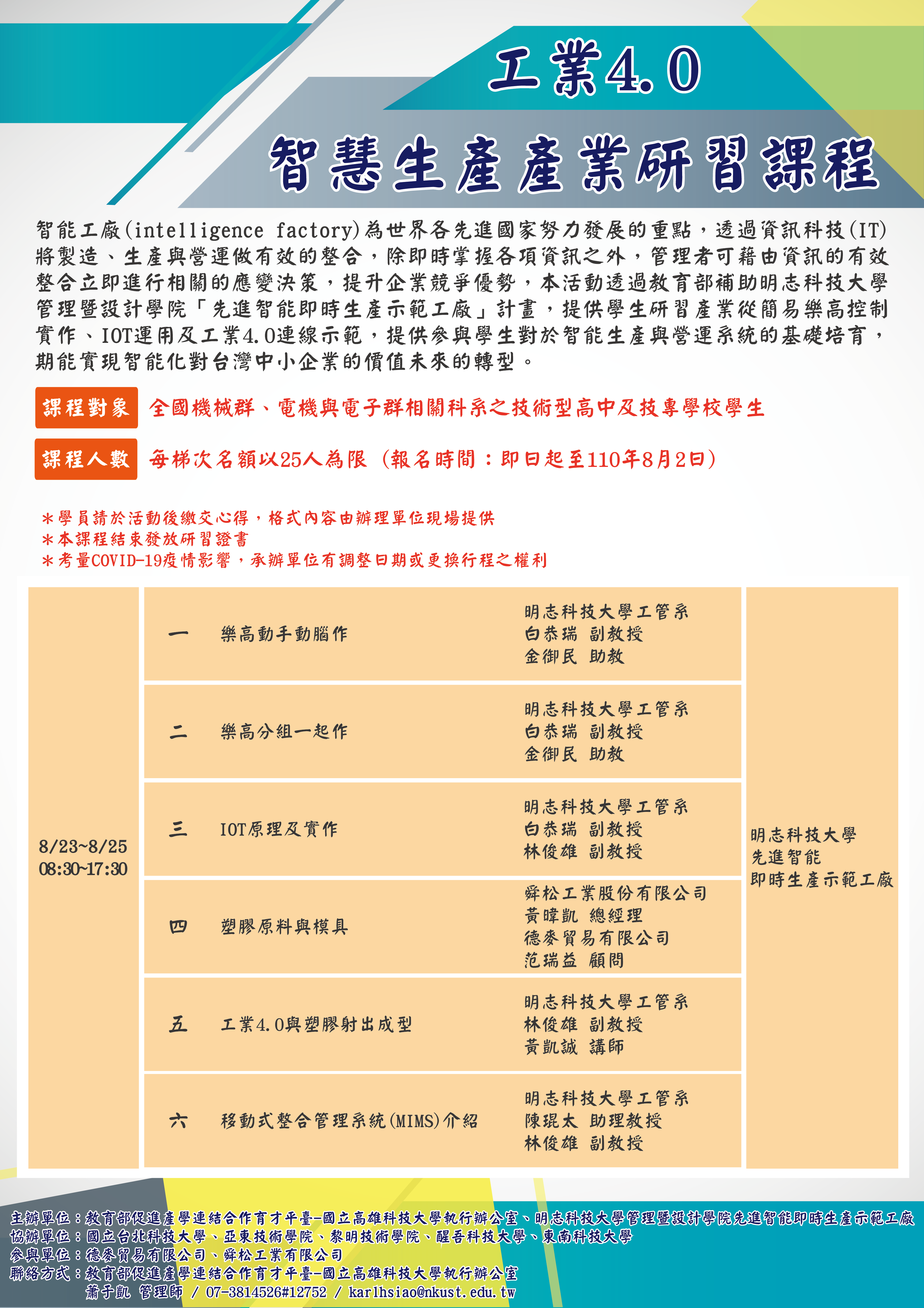 轉知:有關教育部促進產學連結合作育才平臺-國立高雄科技大學執行辦公室與明志科技大學共同辦理「工業4.0智慧生產產業研習課程」。