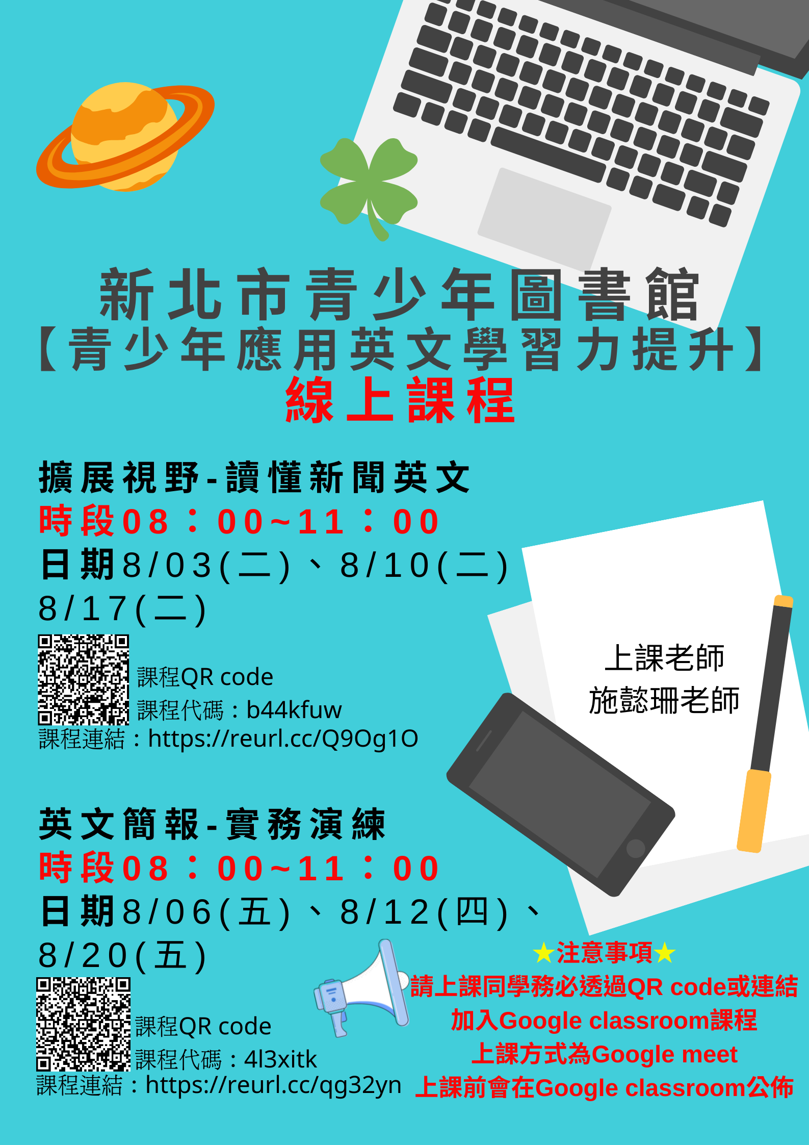 一、為協助青少年面對新課綱,鼓勵養成自主學習習慣,及透過資訊科技啟發創造力,特辦理「青少年應用英文學習力提升計畫」及「108 課綱啟航計畫-青少年小論文寫作」等活動,歡迎學校師生踴躍報名參與。 二、旨揭活動將於線上進行,日程安排如下: 「擴展視野-讀懂新聞英文」課程:8月17日(二)8:00-11:00。 「英文簡報實務演練」課程:8月20日(五)8:00-11:00。 「青少年圖書館小論文工坊」、「線上一起玩桌遊」及「小小氣象員-動手做天氣瓶」等創新學習課程已上架本館新北E書房(https://search.tphcc.gov.tw/eLibrary),歡迎查詢利用。 三、上述各項活動內容及報名詳細資訊,請至本館官網(http://www.library.ntpc.gov.tw/)公告資訊區查詢,如有相關疑問,歡迎來電洽詢新北市青少年圖書館陳小姐,電話:02-22128905轉201。 ![]() ![]() 瀏覽數