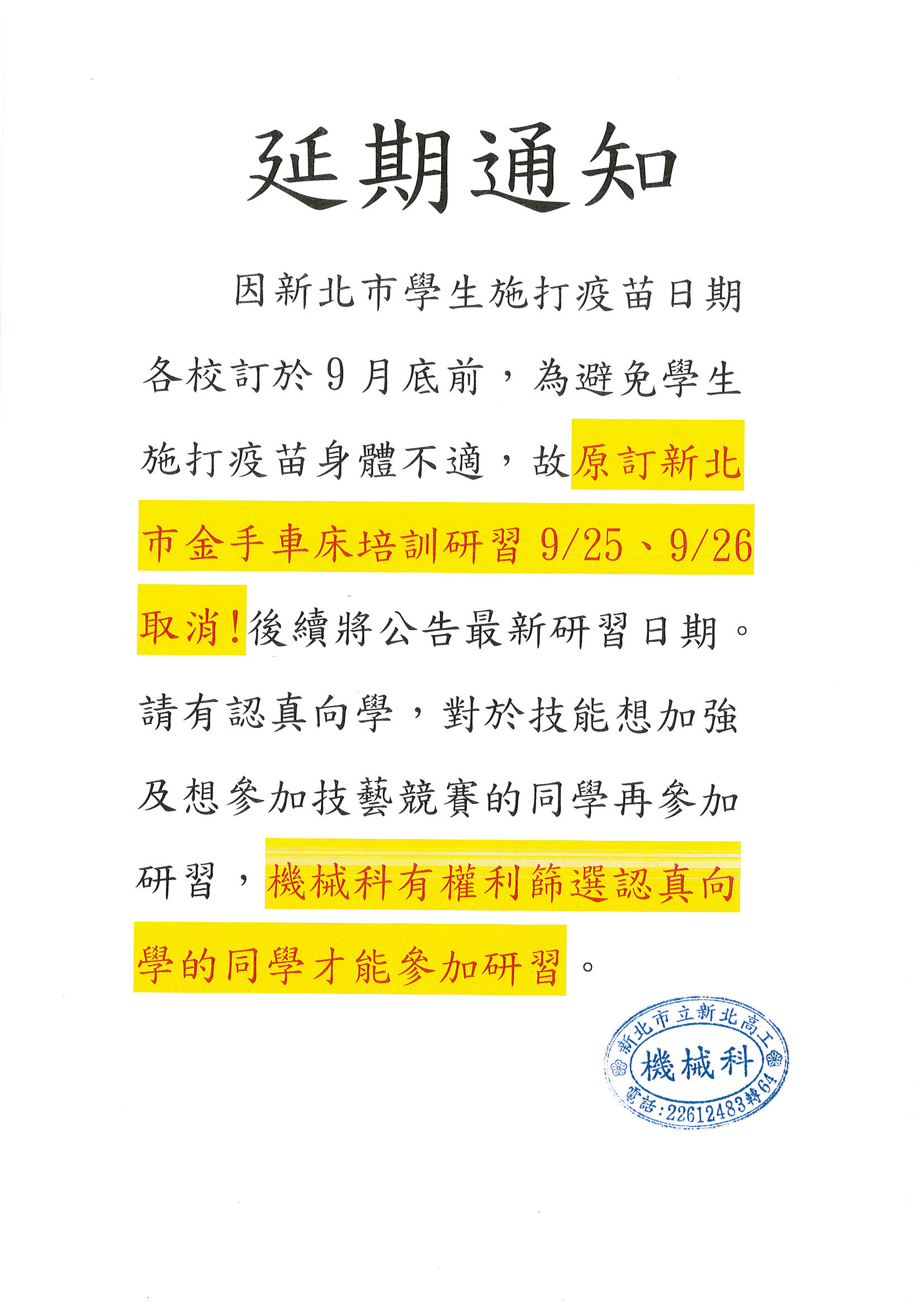 更正【公告】本校高一公民訓練活動留校自習課表