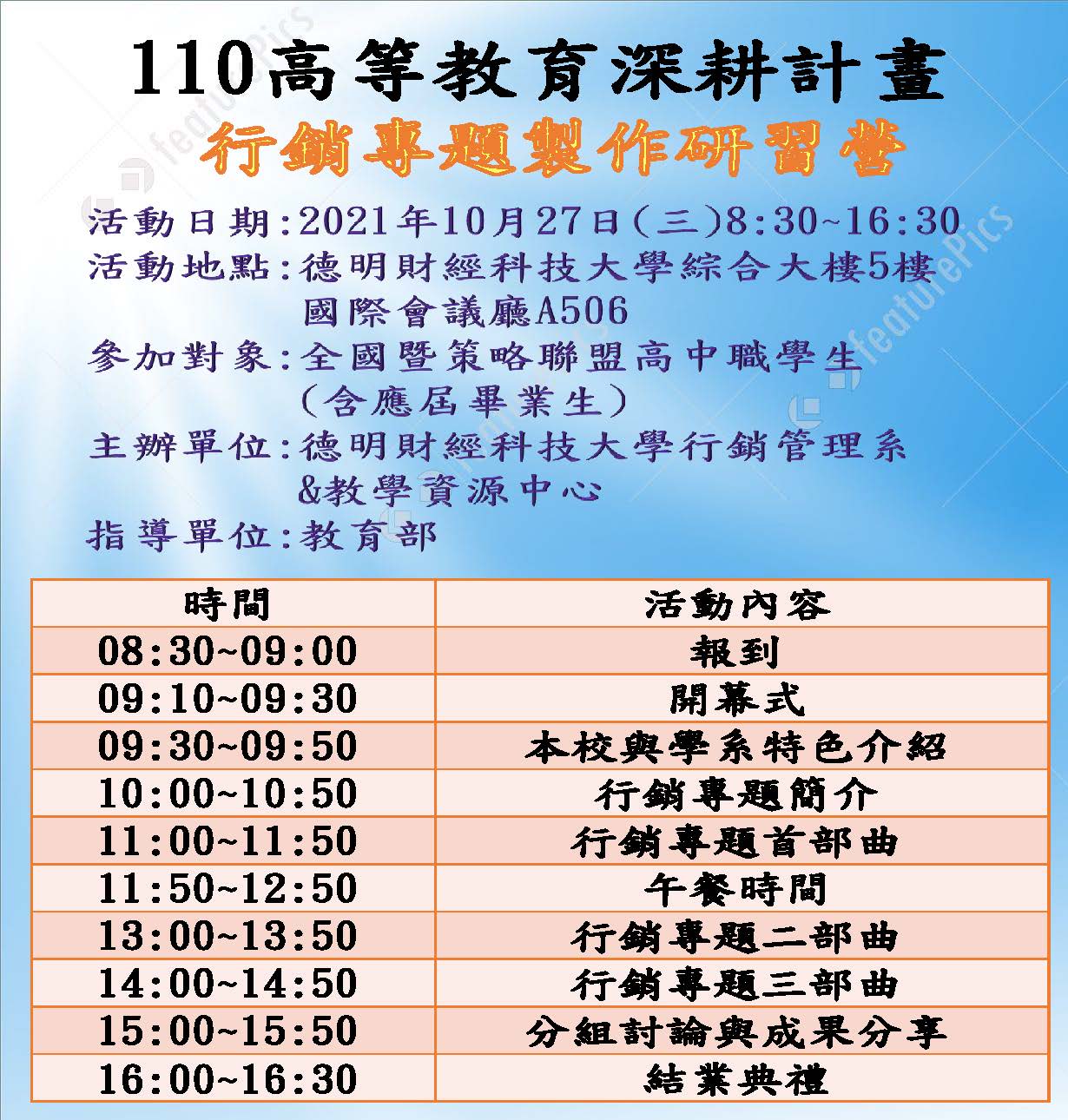 轉知:德明財經科技大學行銷管理系舉辦「110年高等教育深耕計畫行銷專題製作研習營」。