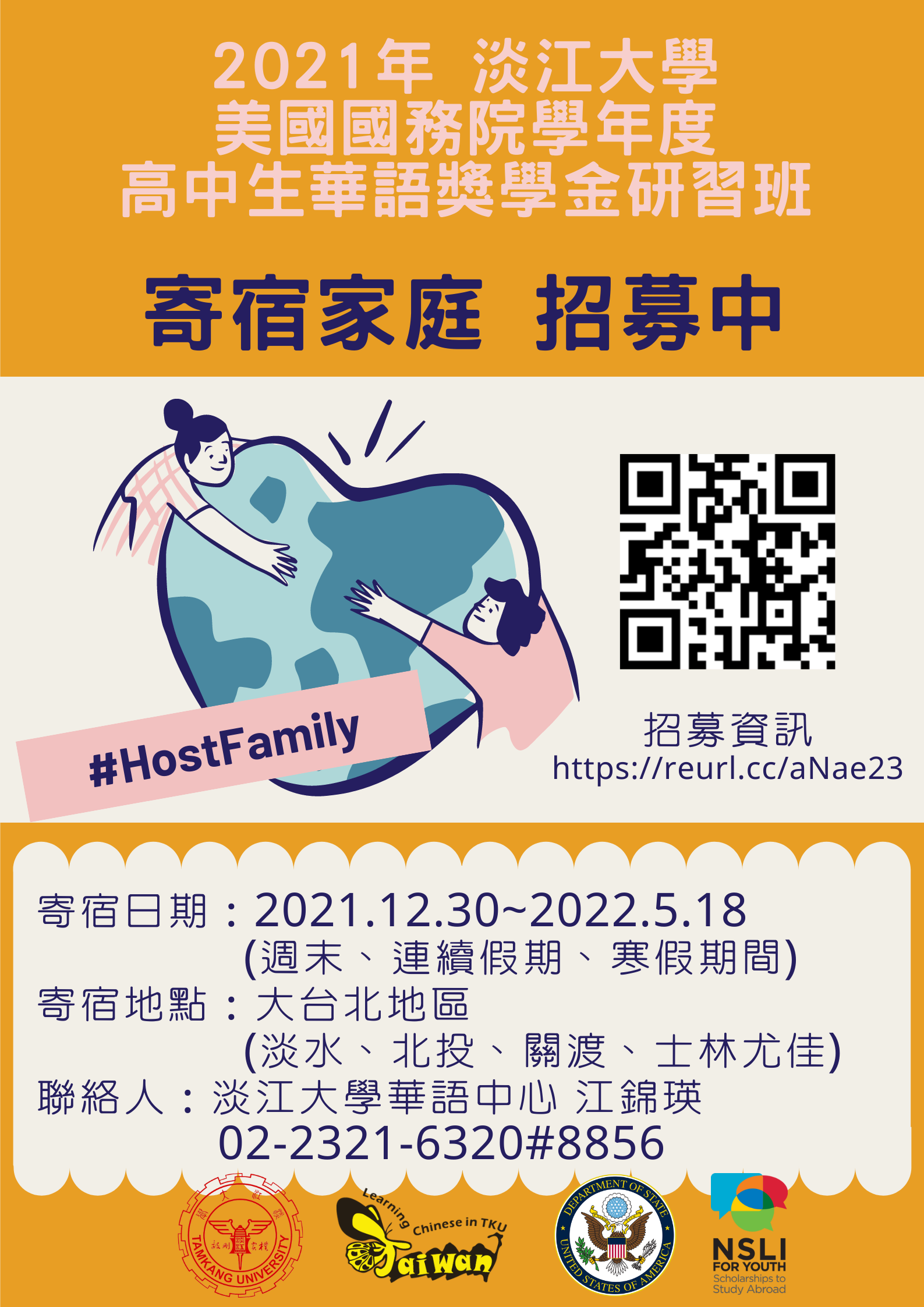 說明: 一、旨揭研習班預計於110年12月6日至111年5月18日赴臺,週間(星期一至五)於本校淡水校園研習華語,上課期間將住在本校淡水校園學生宿舍。 二、為促進美國高中生於在臺學習期間與當地臺灣人進行文化交流、培養日常生活中運用華語能力,故特別尋找對認識美國文化、並願意敞開家門的臺灣家庭,以提供高中生非上課期間的寄宿接待,藉此旨揭家庭與外國學生認識不同風俗習慣與文化的機會。 三、寄宿家庭徵選條件如下: 寄宿時間:自110年12月30日至111年5月18日期間的週末、寒假、春節假期及國定假日等非上課時間。(備註:基於COVID-19疫情關係,實際日期須視國家政策及美方確定可入臺時間,再行調整。) 寄宿地點:大臺北地區(近北投、淡水、關渡、士林尤佳)。 接待條件:需提供學生獨立房間或單人床(上下舖亦可)、學生寄宿期間的膳食及安排學生與家庭共同出遊。 補助金額:寄宿家庭可獲每日新臺幣1,000元整之補助。 檢附徵選計畫海報,報名網址:https://forms.gle/xSRPtVmrwEdGN55w9。 ![]() ![]() 瀏覽數