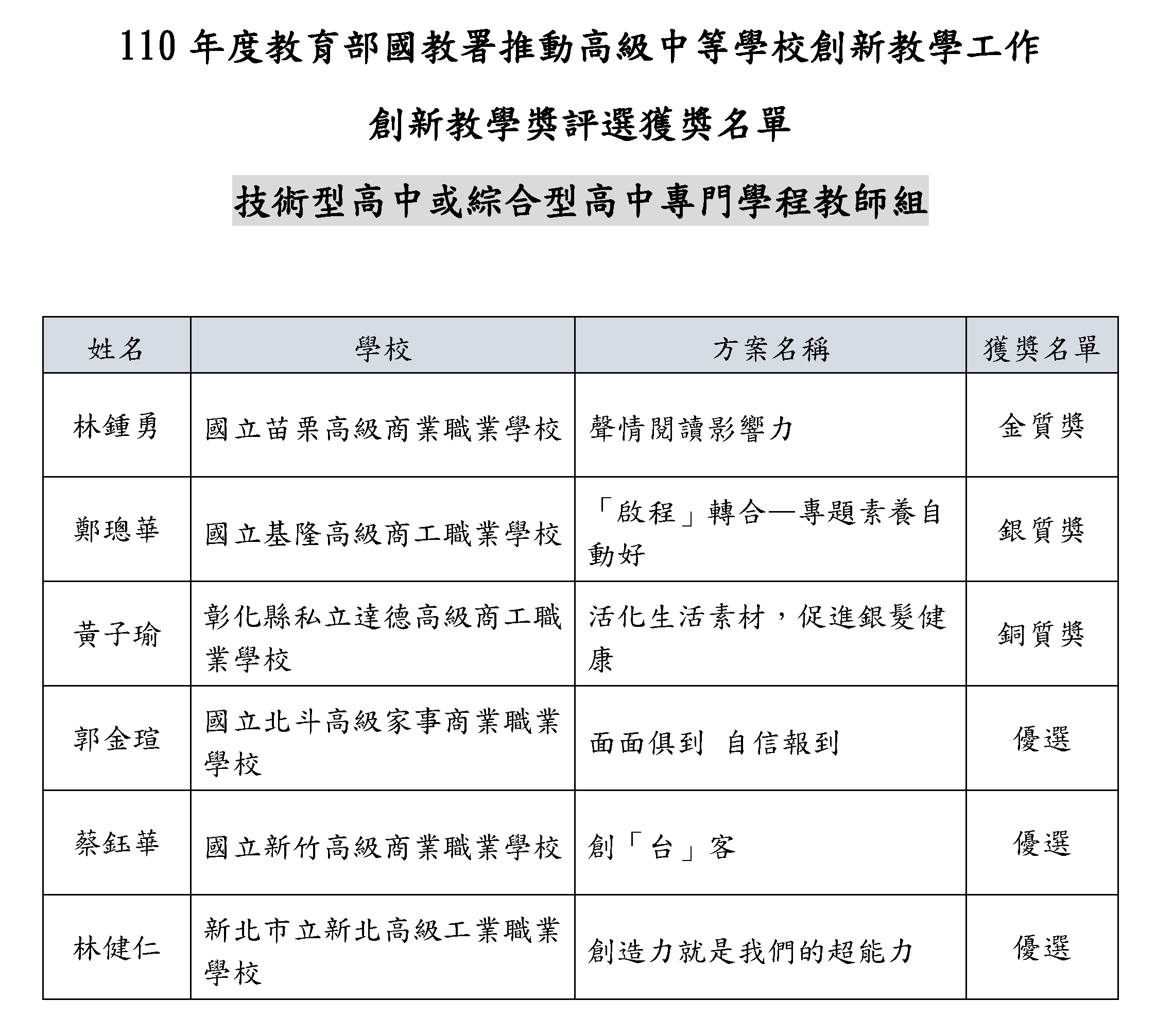 恭喜 電機科 林健仁老師 榮獲110年度教育部國教署創新教學獎評選-優選獎