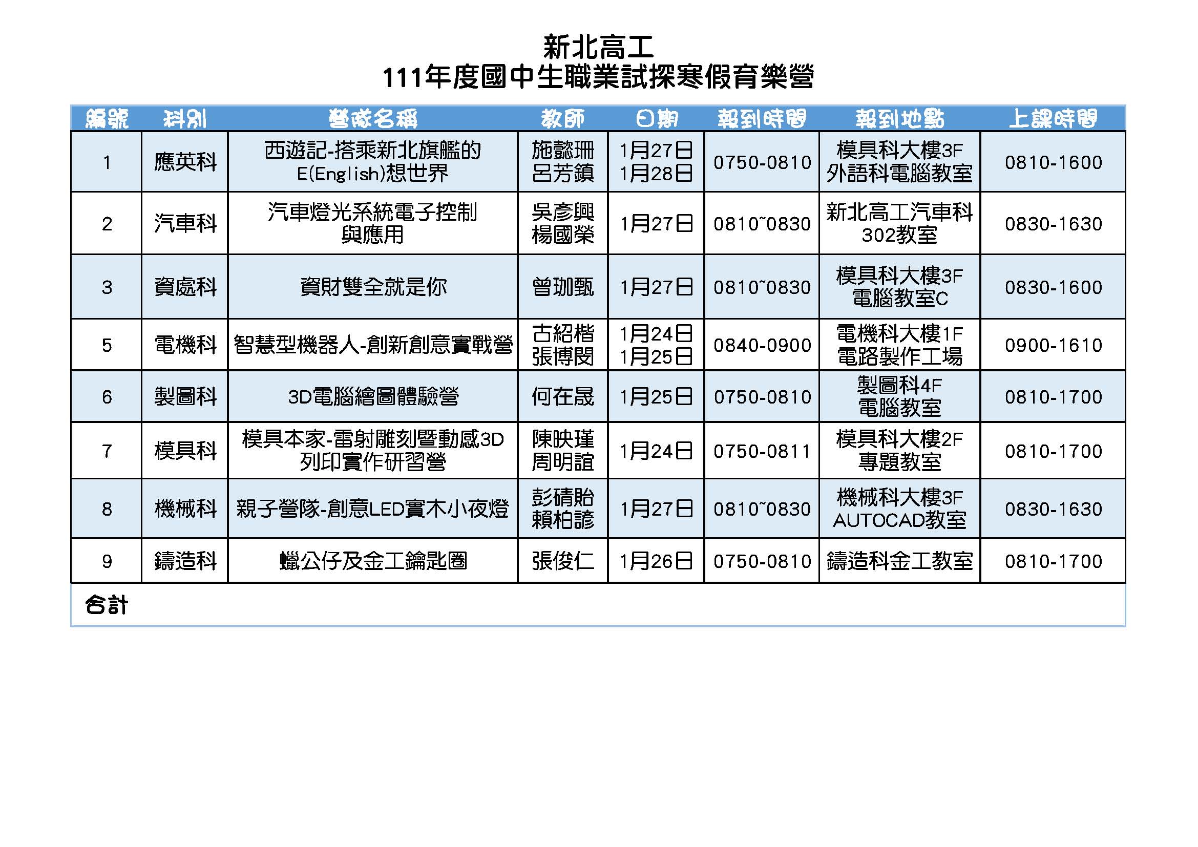 一、 本年度辦理暑假育樂營共計8場,各營隊資訊如下圖,錄取名單詳附件。