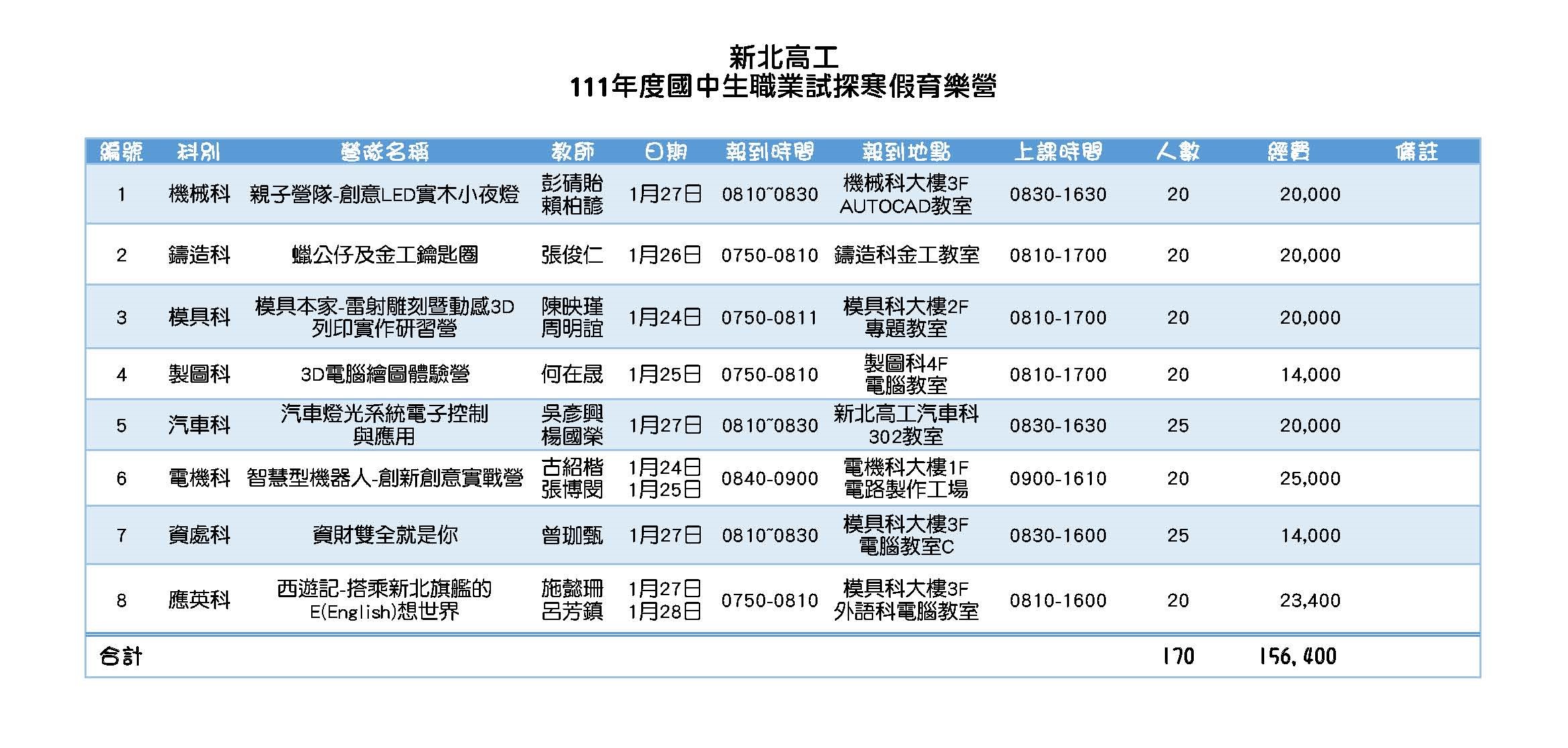 [公告]本校111年度國中生職業試探寒假育樂營錄取名單公告(第1階段及第2階段)