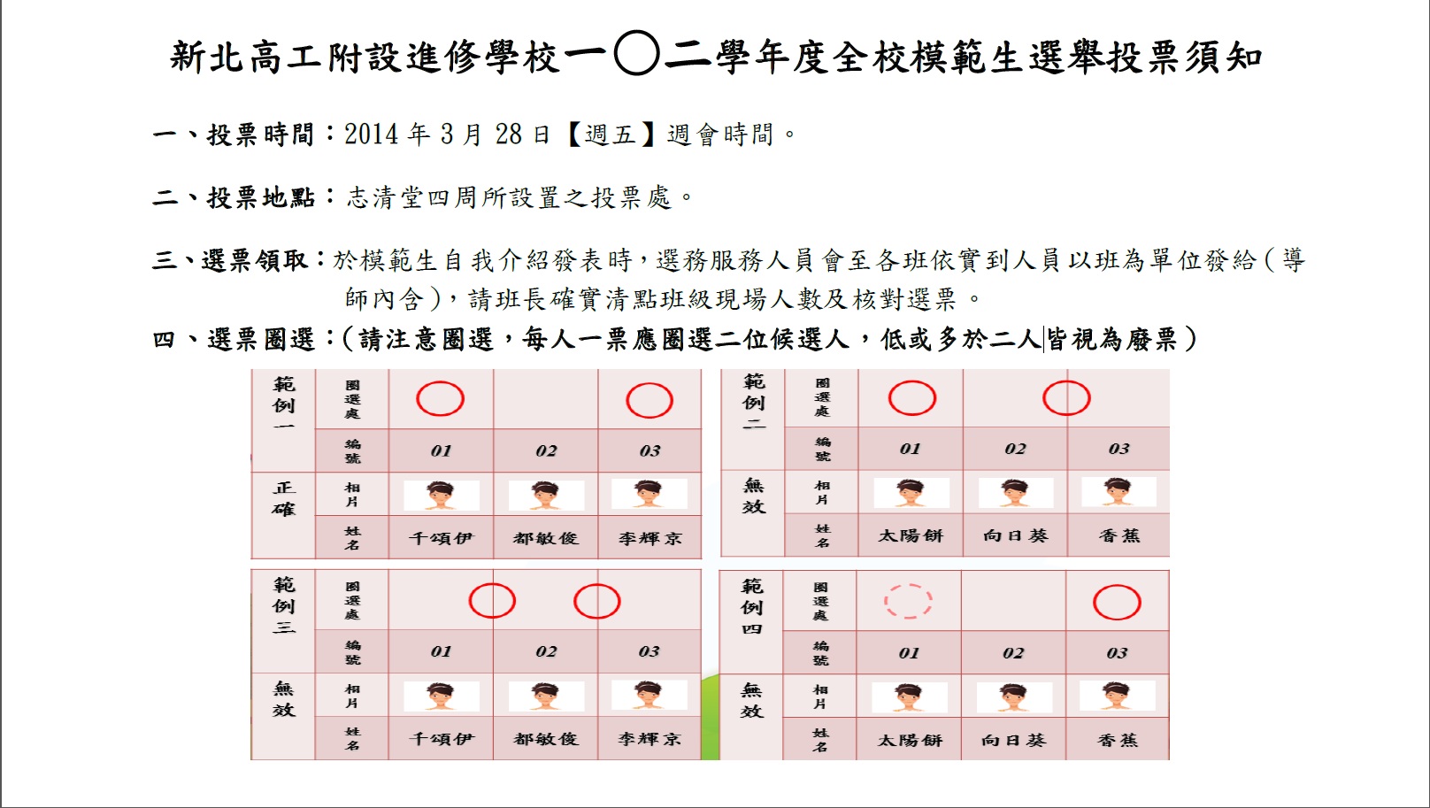 新北高工附設進修學校102學年度全校模範生選舉投票須知
