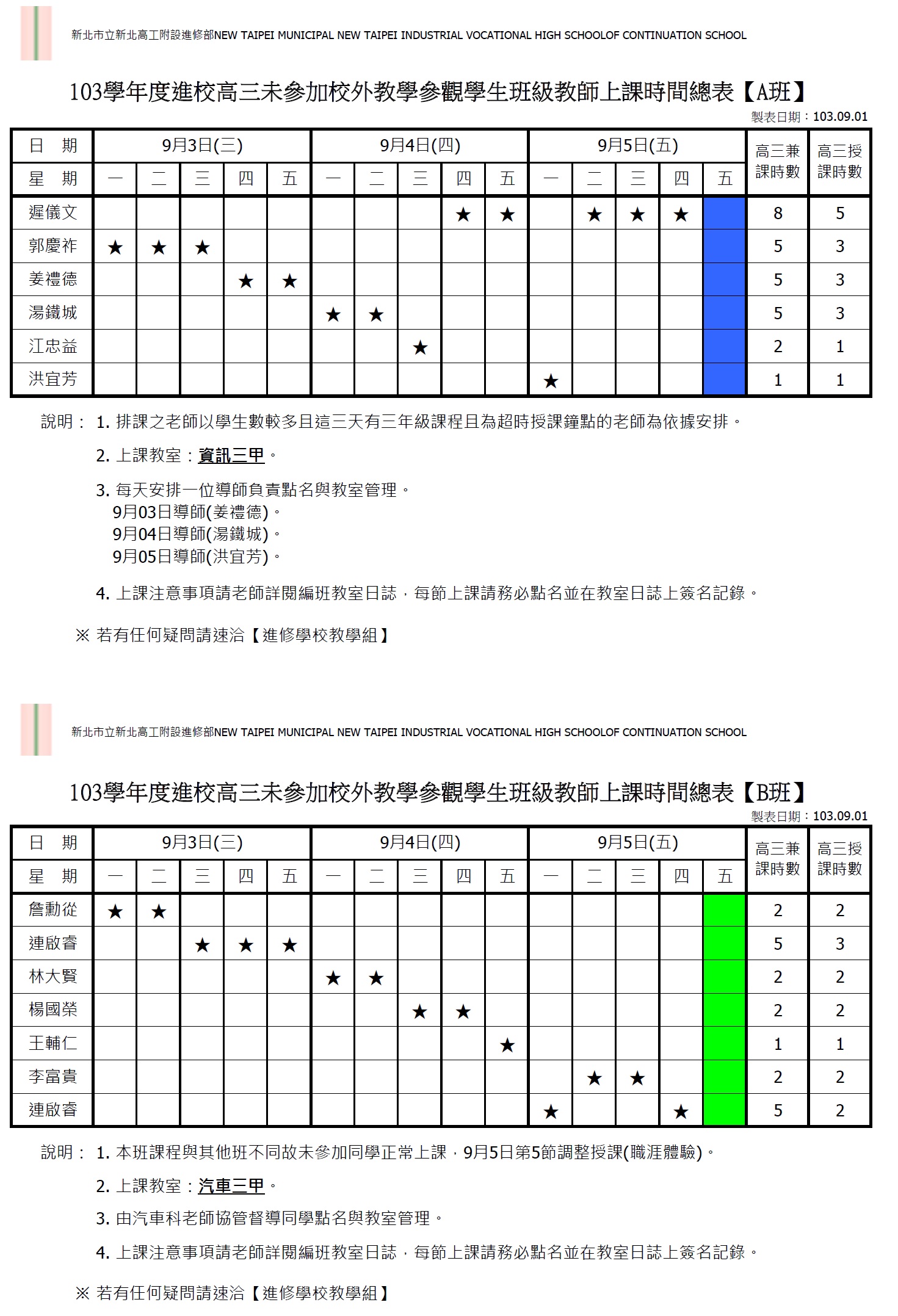 未參加畢業旅行之高三同學 9/3~9/5請至附件中標示之教室上課 B班汽修三甲同學請至汽車科實習工場上課 不得無故缺席