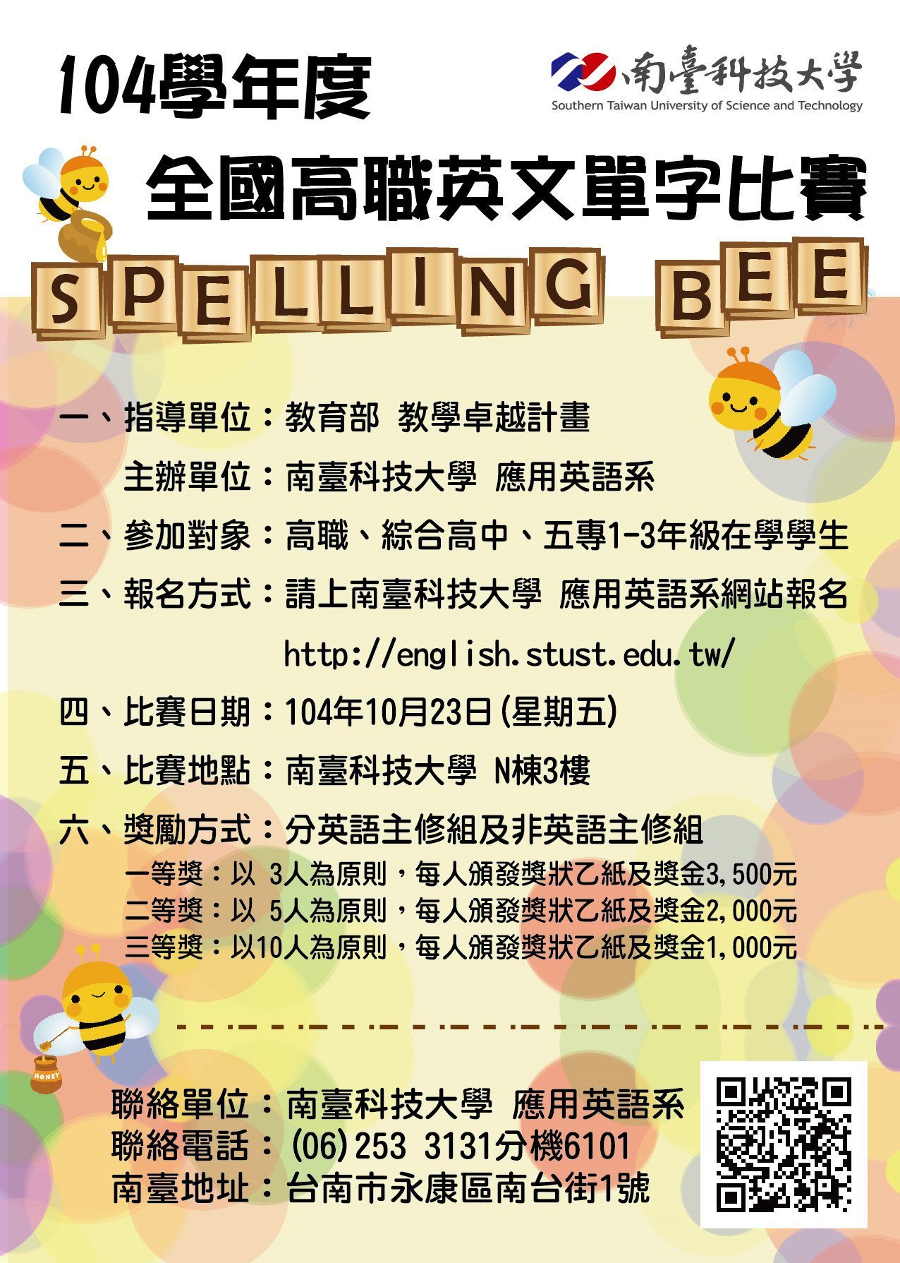 一、南臺科大應用英語系訂於104年10月23日(星期五)舉辦104年度全國高職英文單字比賽。本次比賽報名方式一律採網路報名,報名截止日期104年10月5日(星期一)。