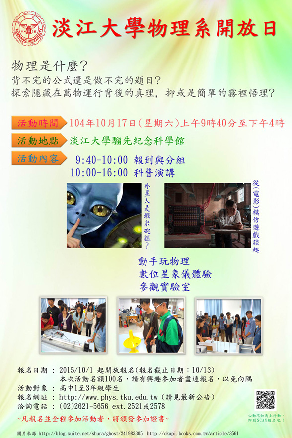 轉知淡江大學舉辦「淡江大學物理系開放日」(如附件活動海報),請轉知所屬物理學科相關教師,並惠予公告周知及鼓勵學生踴躍參加。