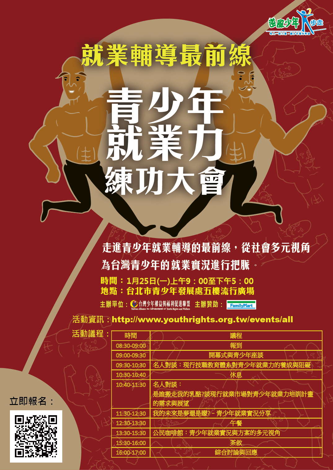 函轉社團法人台灣少年權益與福利促進聯盟辦理之「就業最前線:青少年就業力練功大會」研討會相關資料,歡迎報名。