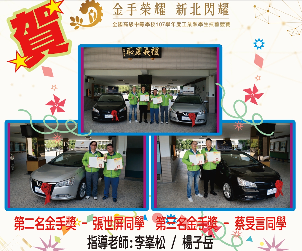 參加107學年度教育部全國工業類科高中職學生技藝競賽,分別榮獲<汽車修護職類>第二名與第三名金手獎