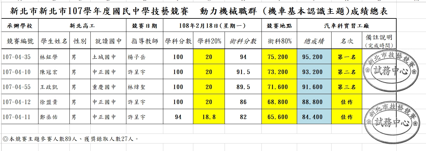 賀~新北市107學年度動力機械職群-汽車基本認識主題競賽成績優異-新北高工培訓