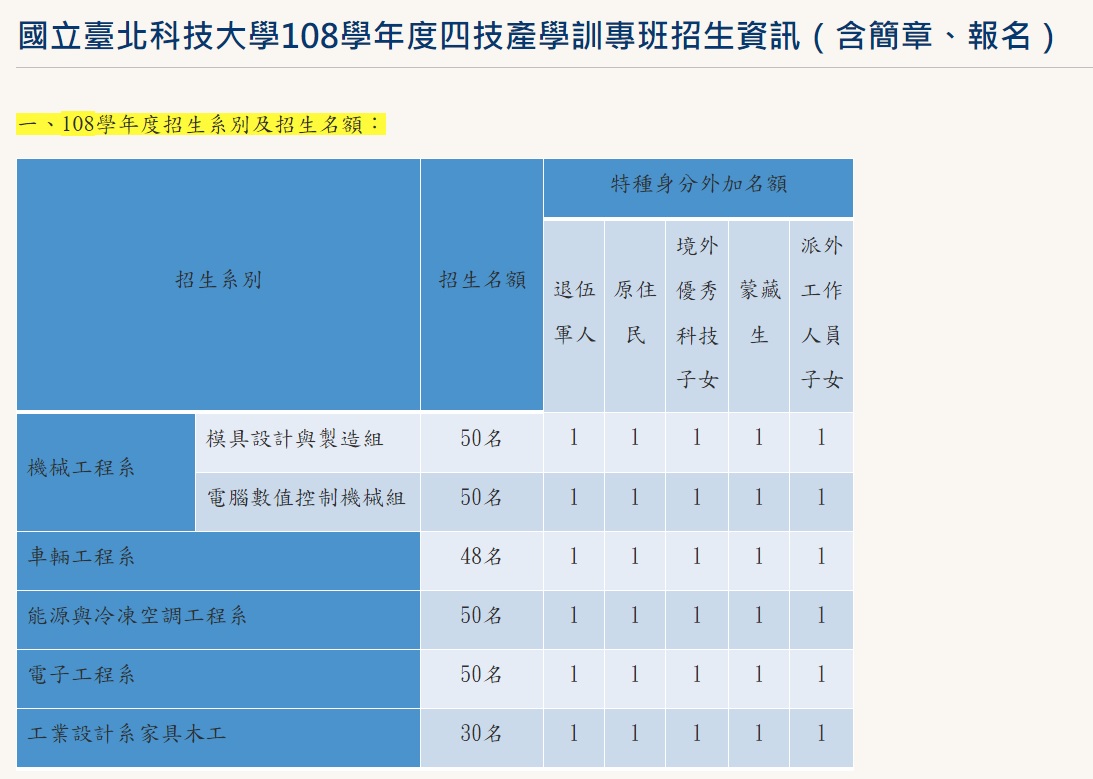 國立臺北科技大學108學年度四技產學訓專班招生資訊(含簡章、報名)