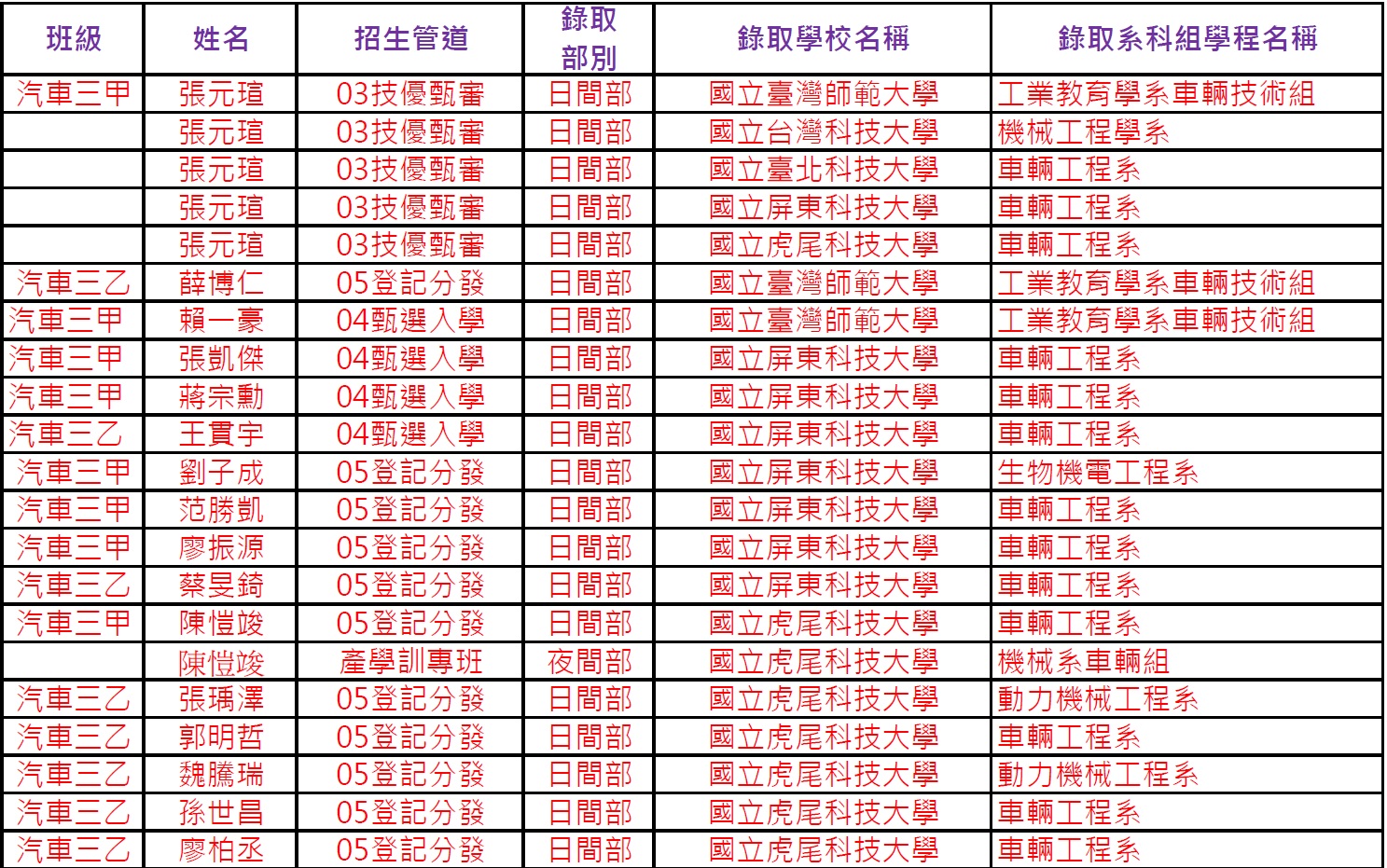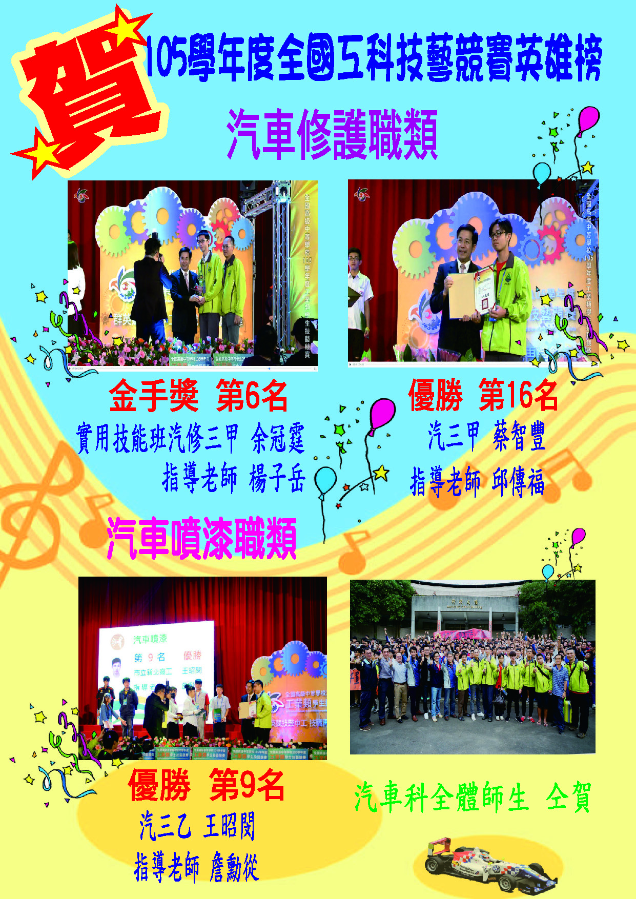賀~105年度全國高中職工業類科汽車科學生技藝競賽榮獲佳績