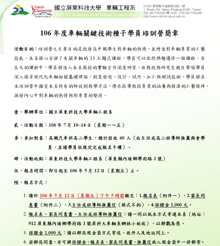 106年度屏科大車輛關鍵技術種子學員培訓營簡章