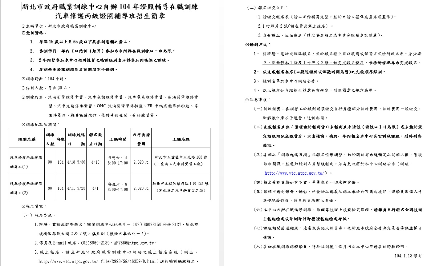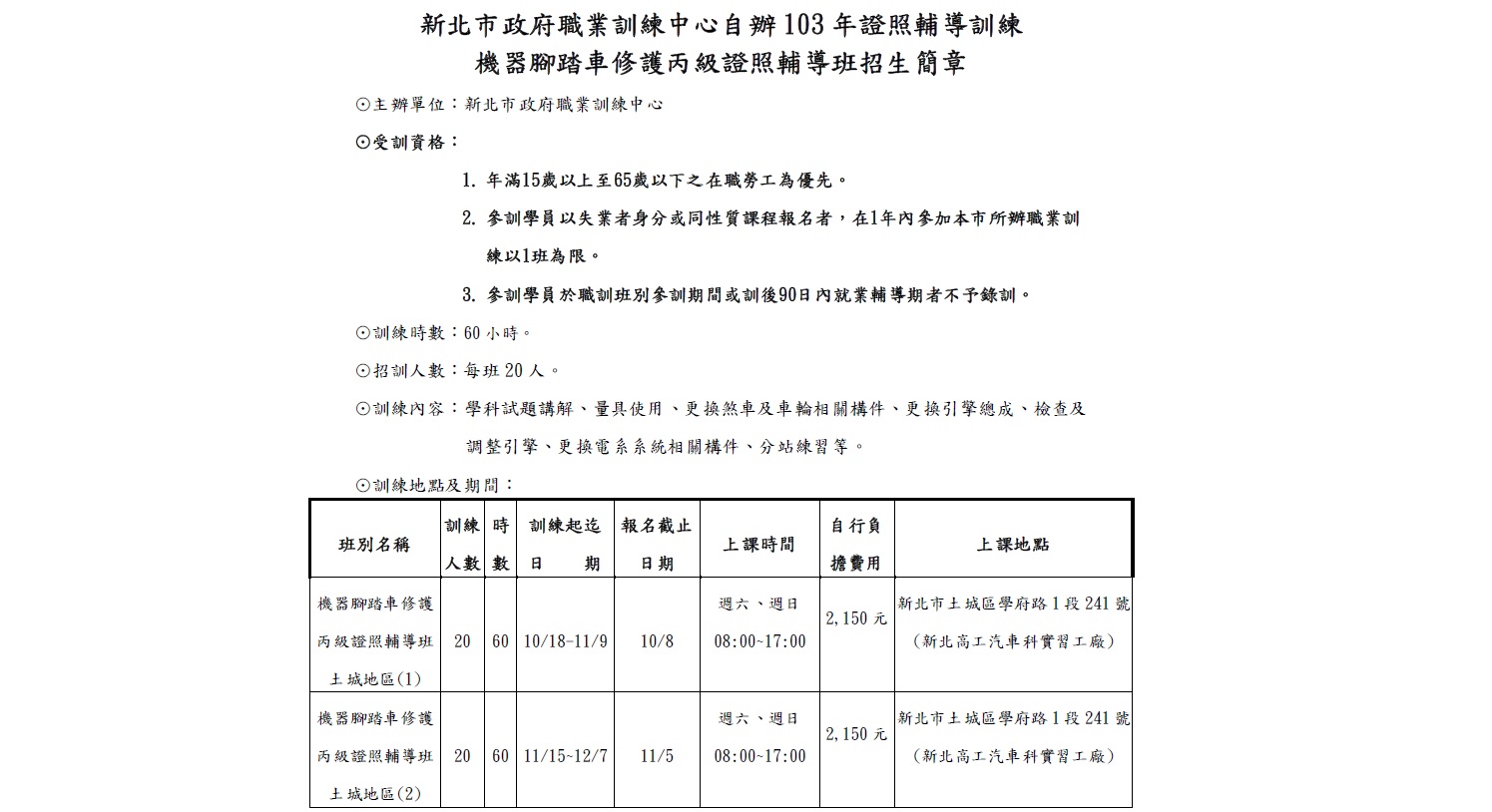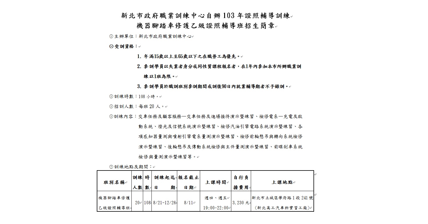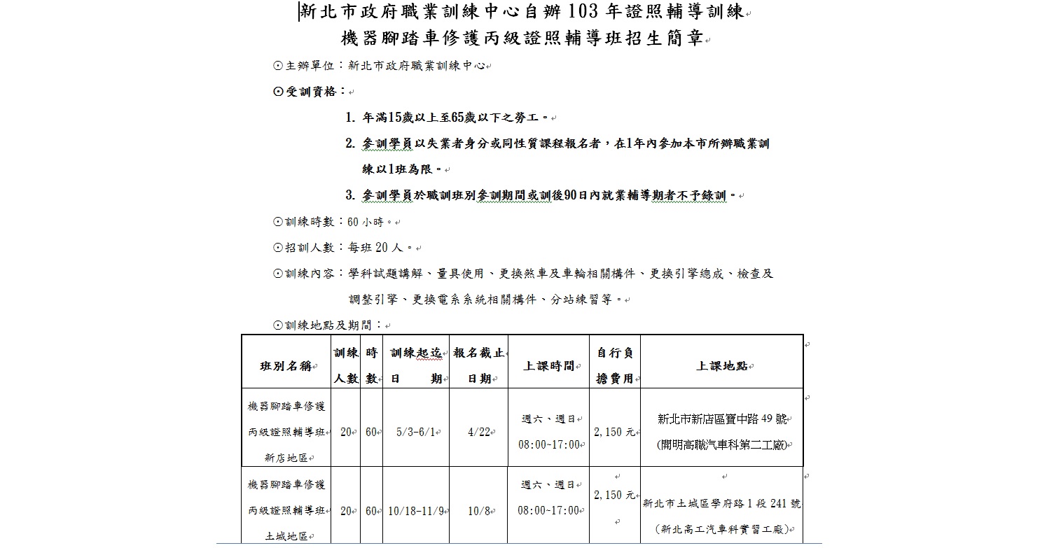 103年新北職訓中心機器腳踏車修護丙級證照輔導班-簡章及報名表0422