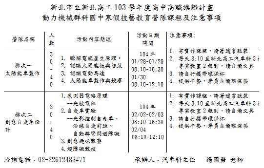103學年度新北市動力機械職群國中寒假技藝教育營隊計畫與課程表