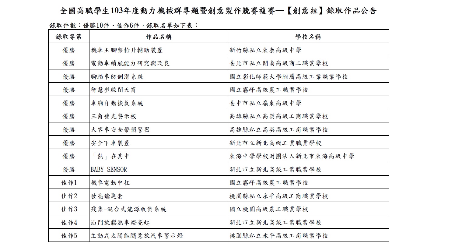 全國高職學生103年度動力機械群專題暨創意製作競賽複賽-錄取名單