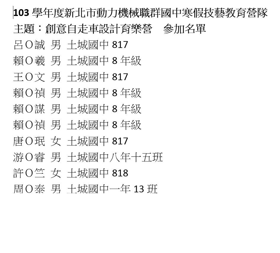 公佈103學年度新北市動力機械職群國中寒假技藝教育創意自走車設計營隊參加名單